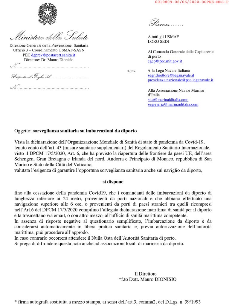 La misura è stata recentemente adottata dal Ministero della Salute, che ha già provveduto a comunicarla al Comando delle Capitanerie di Porto. Essa resterà in vigore fino alla cessazione della pandemia, salva nuova comunicazione.