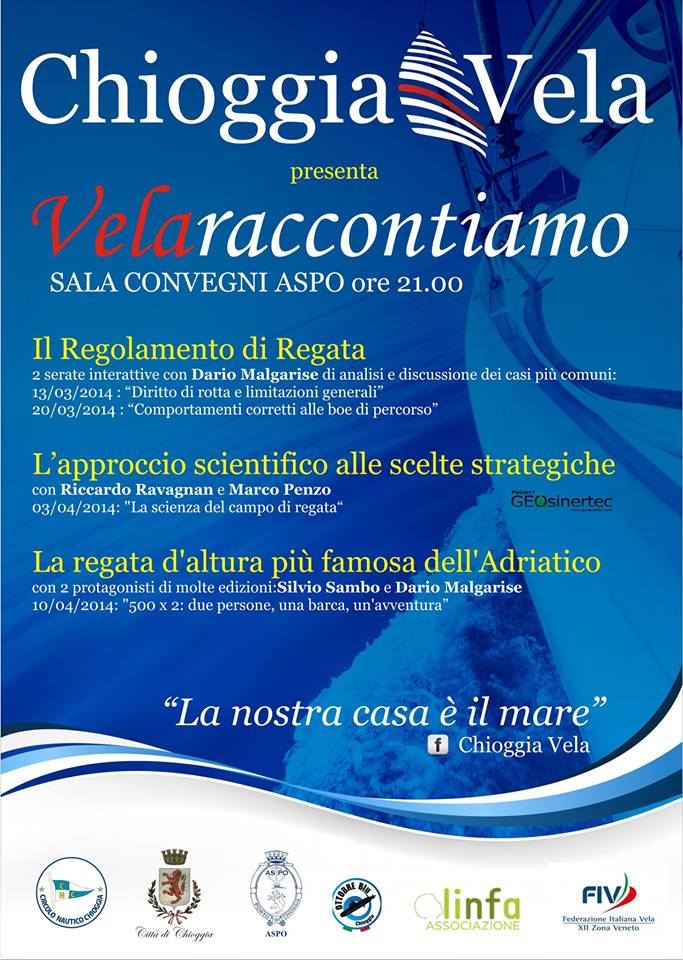 Gli incorri termineranno il 10 aprile dove protagonista sarà la vela d’altura con la sua regata più famosa in Adriatico, ossia “La cinquecento per due” che nella scorsa edizione ha visto grandi protagonisti Silvio Sambo e Dario Malgarise, presenti alla serata. La sede degli incontri sarà presso la Sala Convegni dell’A.SPo Chioggia in zona Val da Rio con inizio alle ore 21.