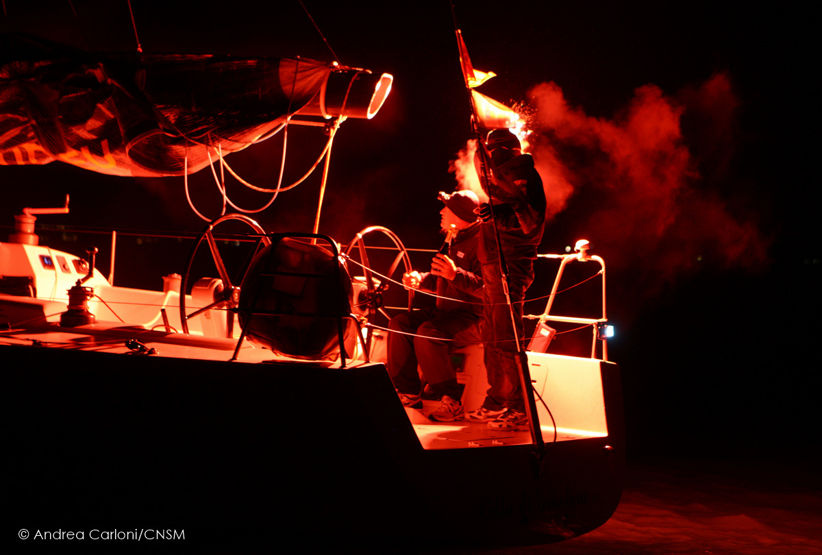 Alle 21.56.29 è la volta della prima imbarcazione della classe 200×2, il Felci 45 Città di Grisolera NPS System di Franco Daniele e Cesare Bressan vincitori del Trofeo Paulaner Line Honour X2, che ritrovano smalto e voglia di regatare insieme dopo la 500×2 del 2008.