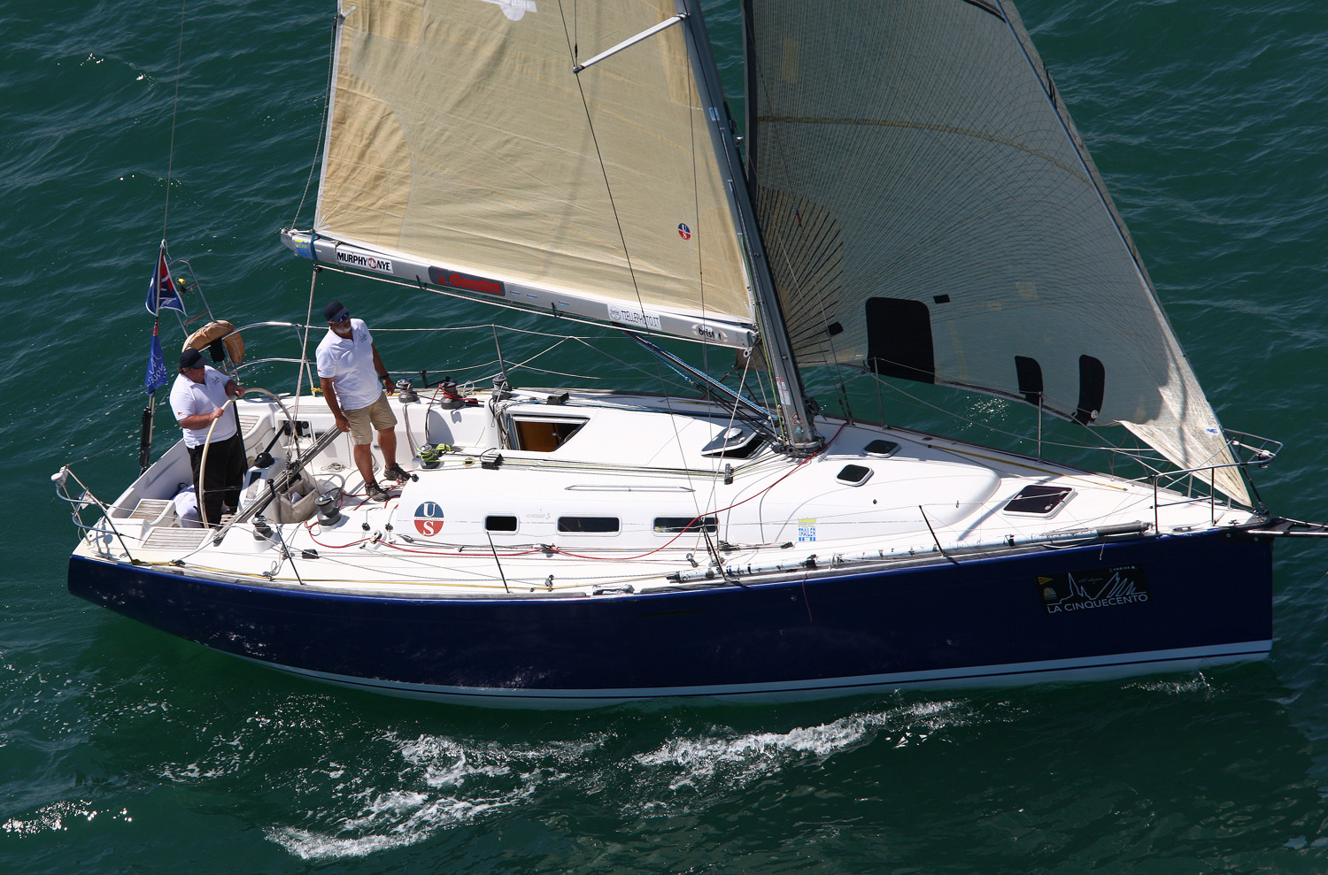 Partenza attardata per Beppe Bisotto e Peter Leitner su Atame! che hanno tagliato il traguardo alle 14.53 a causa di problemi tecnici fortunatamente risolti e che si sono lanciati con la barcaperfettamente a segno all’inseguimento della flotta.