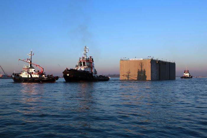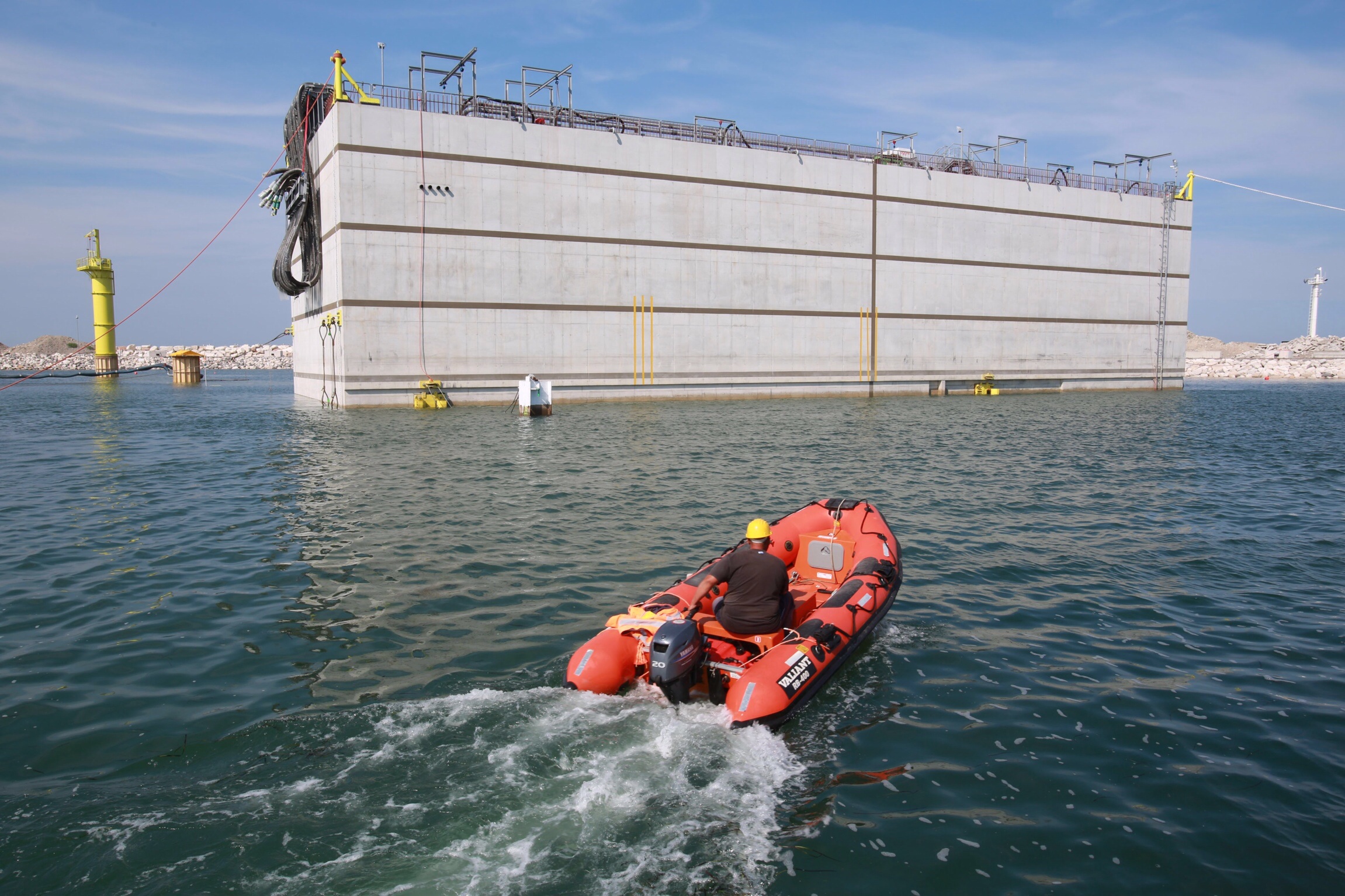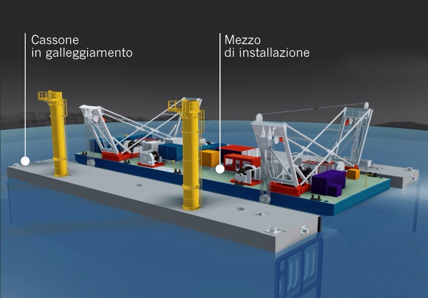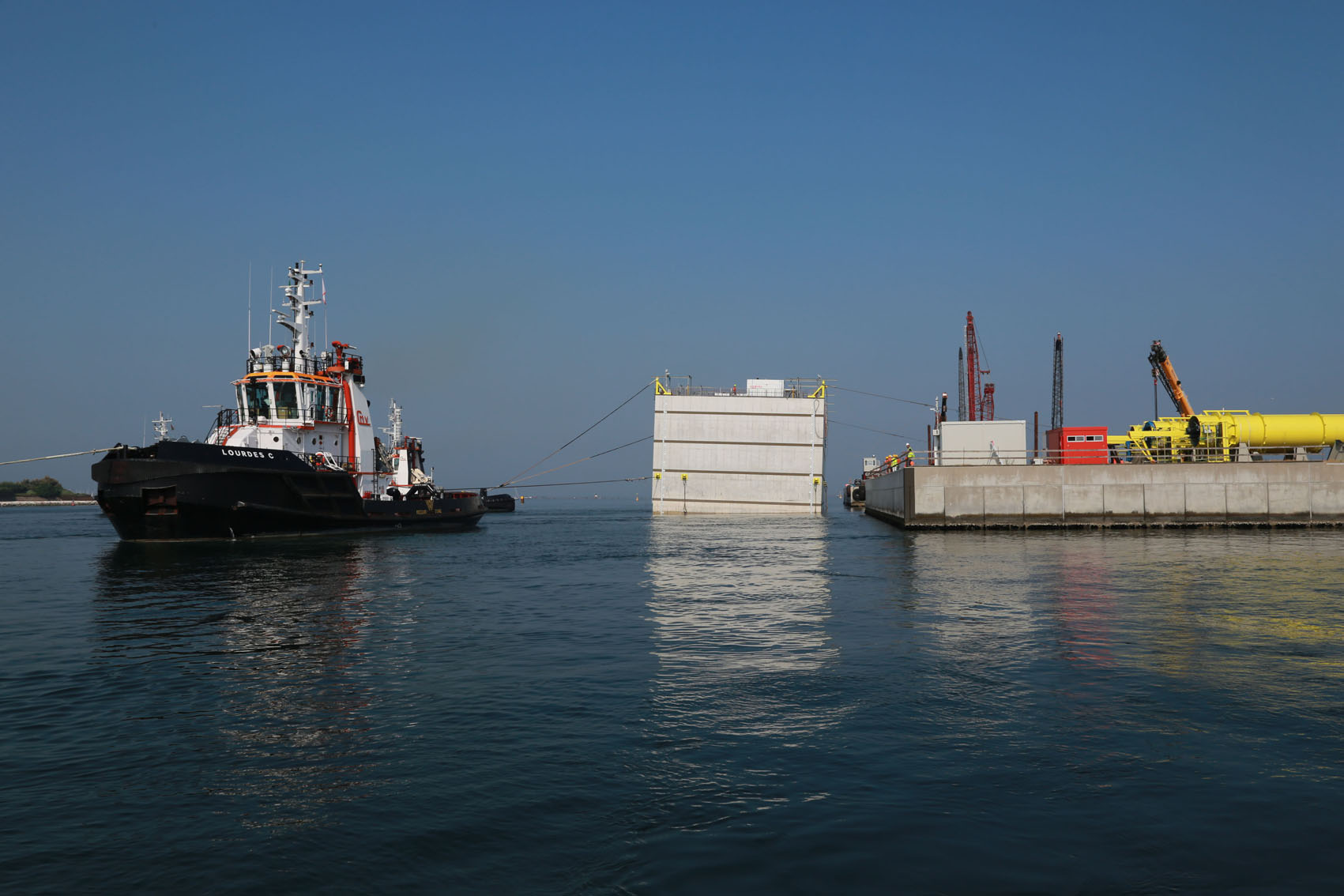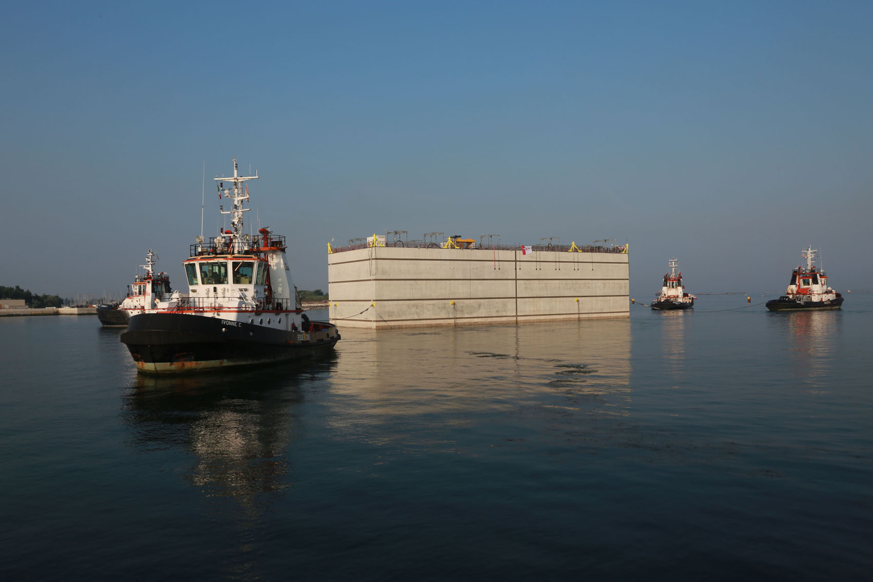 Si tratta del “cassone di spalla”, che ha una lunghezza di oltre 60 m, una larghezza di 20 m per un’altezza di quasi 25 m (di cui solo 2 m escono dall’acqua). A Chioggia, sono 8 i cassoni, 2 ‘di spalla’, ai lati della barriera, e 6 di alloggiamento. Una volta alloggiati, conterranno le 18 paratoie necessarie per la bocca di Chioggia.