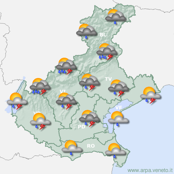 Domenica 24 tempo variabile. In pianura alternanza di schiarite e annuvolamenti, con frequenti tratti soleggiati. In montagna nubi irregolari al mattino e attività cumuliforme pomeridiana. Precipitazioni in pianura generalmente assenti, salvo qualche locale e breve fenomeno. In montagna probabilità da bassa (5-25%) nelle prime ore per residui fenomeni a medio-bassa (25-50%) dal pomeriggio di rovesci e isolati temporali specie sui settori prealpini. Le temperature saranno generalmente stazionarie le massime, in ulteriore calo le minime. I Venti in pianura nord-orientali generalmente moderati, con rinforzi di Bora sulla costa. In montagna deboli a regime di brezza nelle valli, moderati dai quadranti occidentali in quota. Il mare inizialmente mosso, in seguito poco mosso.