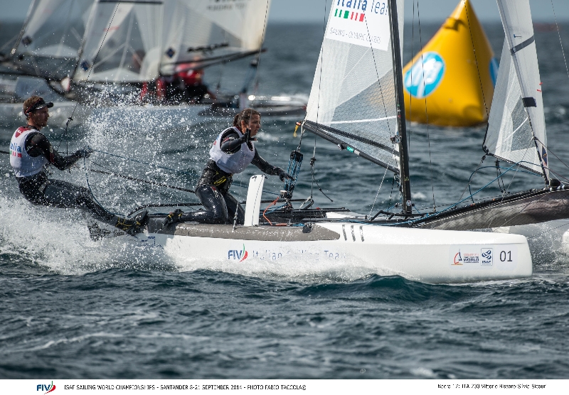 Vittorio Bissaro e Silvia Sicouri chiudono il Mondiale ISAF di Santander in quarta posizione, perdendo una medaglia sull´arrivo della Medal Race, ma portando a casa la qualificazione dell´Italia per le Olimpiadi di Rio 2016. Il finale dolceamaro di un campionato molto difficile, cominciato con il piede sbagliato (26esimi dopo le prime due prove) e combattuto sempre in recupero, fino alla seconda posizione provvisoria prima della Medal Race. Nella regata finale con punteggio doppio riservata ai primi dieci, ben cinque equipaggi si giocavano due medaglie ed il risultato é stato incerto fino all´arrivo. Pochi metri, mezza lunghezza hanno separato i portacolori della Fraglia Vela Malcesine e della Compagnia della Vela Grosseto dal podio mondiale.