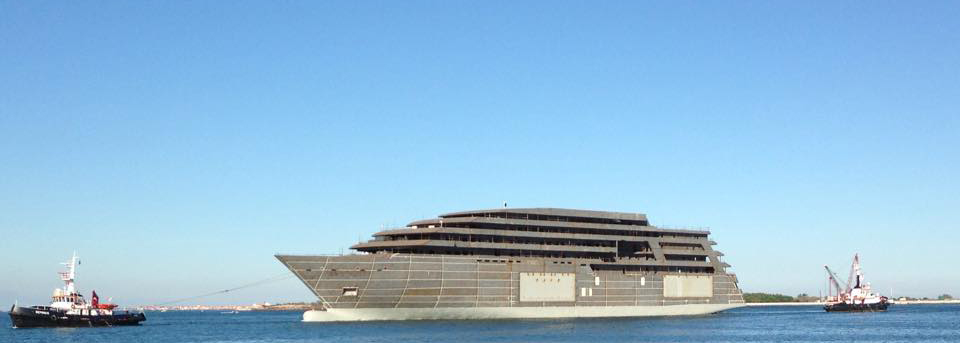 La nave, ancora allo stato grezzo e in consegna entro la metà del 2015, avrebbe dovuto essere trainata da un rimorchiatore d’altura proveniente dalla Croazia fino a Genova, ma per motivi meteo il viaggio è stato rimandato.
