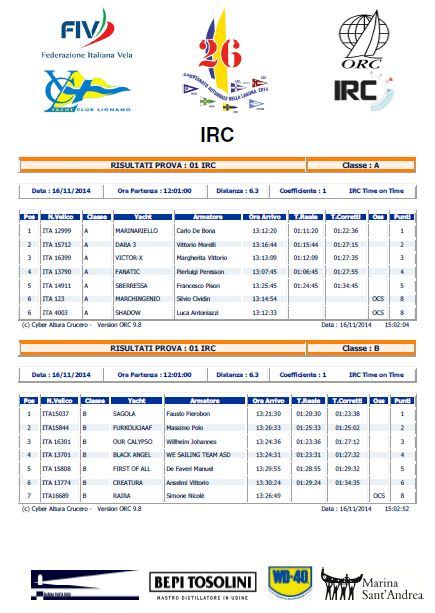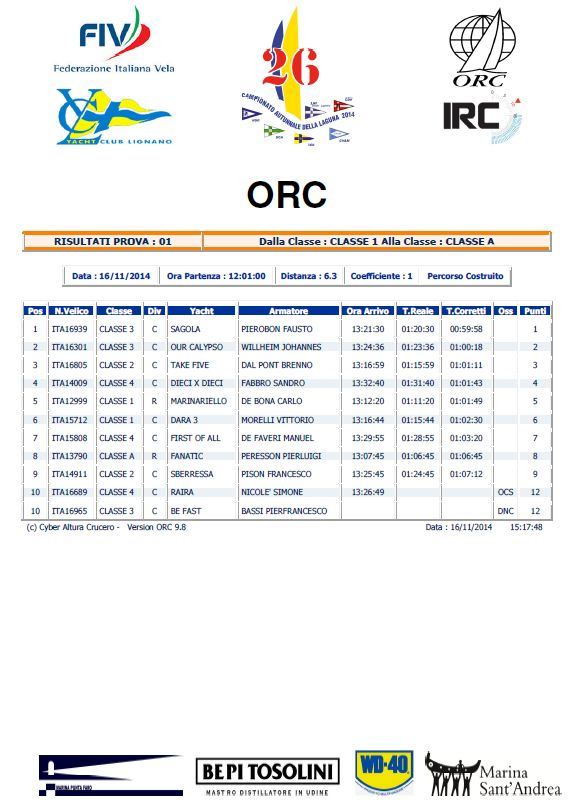 Tra gli IRC si sono contraddistinti Marinariello (YCLignano) primo nella classe A e Sagola primo nella classe B. Tra gli ORC sempre Sagola in classe 3, Dara 3 in classe 1, Take Five in classe 2 e Dieci x Dieci in classe 4.