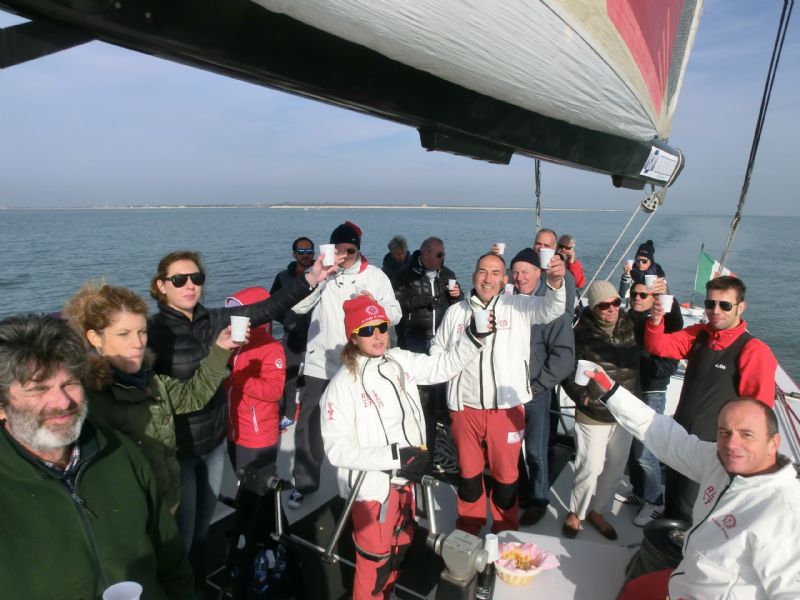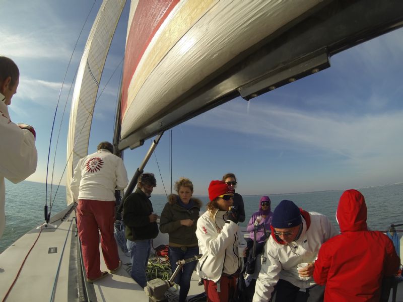 Il sole ed il mare calmo hanno compensato il debole vento che ha permesso, però, di effettuare una veleggiata di circa 5 ore e di apprezzare le doti veliche della storica barca. Virate e strambate si sono simpaticamente intrecciate con ripetuti brindisi, a scapito della abbondante scorta di prosecco in kambusa.