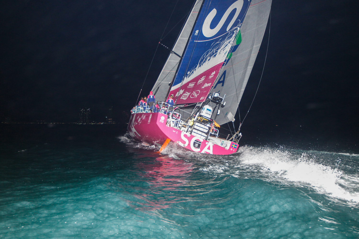 E’ nel buio della notte di Abu Dhabi che l’equipaggio femminile di Team SCA ha potuto concludere la seconda tappa della Volvo Ocean Race 2014/15. Lo scafo magenta ha infatti tagliato la linea del traguardo alle 2.23 ora locale, cioè alle 23.23 ora italiana. L’equipaggio guidato dalla skipper britannica Sam Davies ha percorso 6.500 miglia (reali) fra Città del Capo e Abu Dhabi in 25 giorni, 6 ore, 23 minuti e 34 secondi chiudendo in sesta posizione.