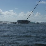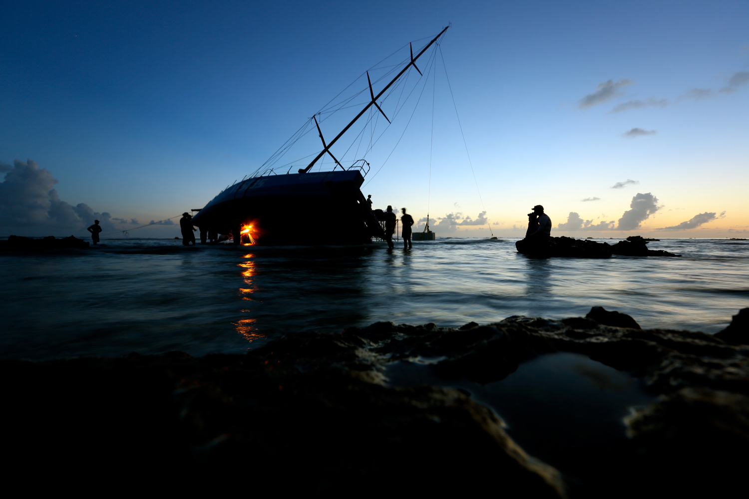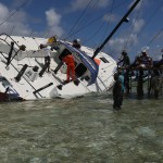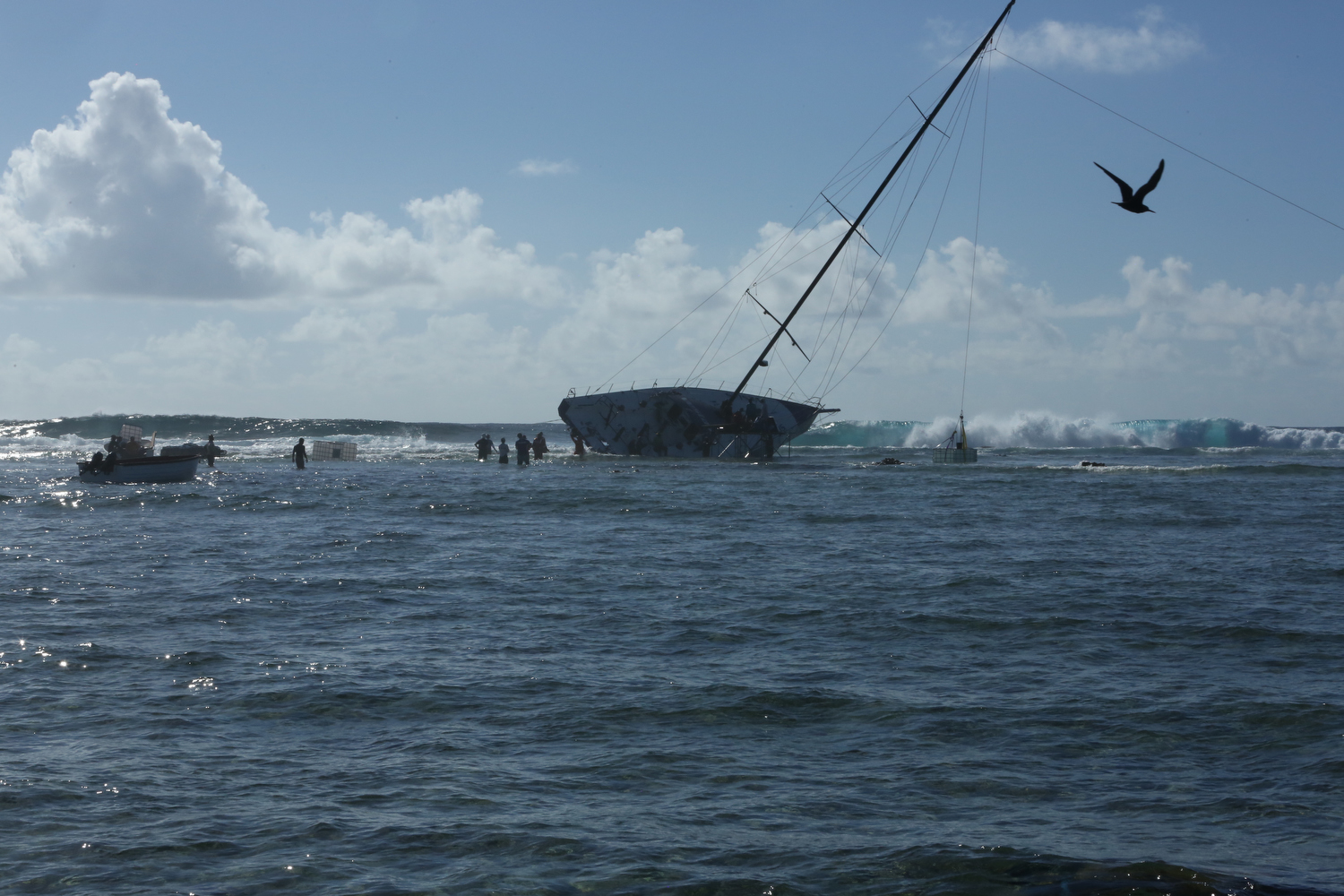 Lo shore manager del team Neil Cox ha aggiunto: “Abbiamo dovuto rivedere in parte in nostri piani e rimodulare il progetto, abbiamo dovuto essere molto cauti e lavorare velocemente. Abbiamo sempre saputo che si sarebbe trattato di un lavoro pieno di ostacoli, ma a maggior ragione dopo tre giorni di lavoro continuo per ripulire la zona e garantire l’integrità strutturale della barca. Siamo stati davvero fortunati perché fin dal primo momento, abbiamo costruito un’ottima relazione con le persone che vivono sull’isola. Abbiamo utilizzato la mano d’opera locale e senza di loro non avremmo assolutamente potuto portare a termine il progetto. Si tratta di una decina di persone. Sono rimaste con l’acqua all’altezza delle ginocchia, con le onde che li investivano tutta la giornata, ci hanno portato delle bombole di ossigeno per permetterci di poter tagliare la chiglia e ci hanno aiutato a spostare la barca nella laguna, per evitare che i pezzi potessero spargersi sul reef.”