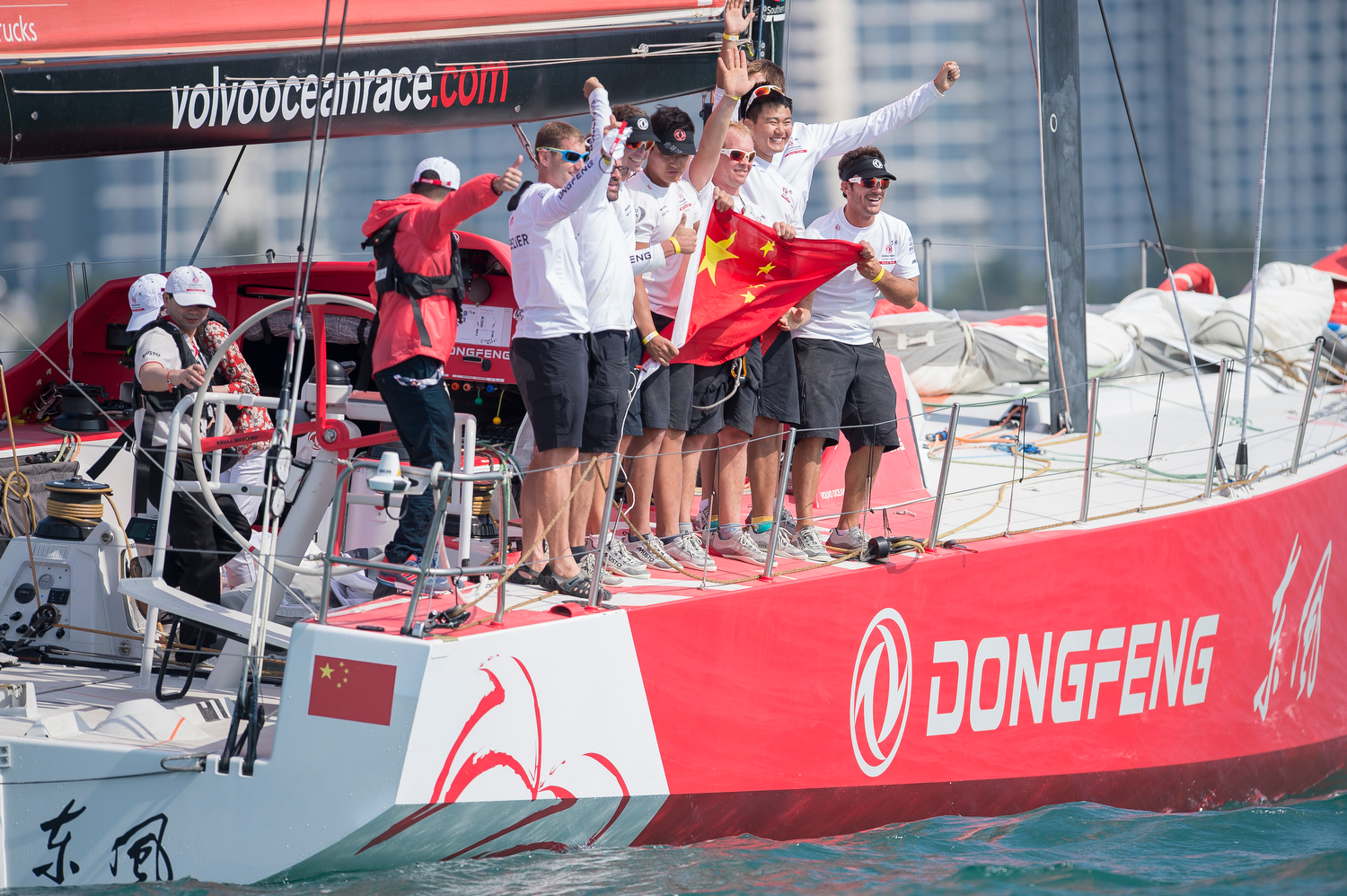 La prova si è svolta su un percorso a bastone di poco più di sette miglia totali, con una decina di nodi vento e fra due ali di barche spettatori e si è conclusa in poco meno di un’ora. Il comitato di regata ha dato il segnale dello start in perfetto orario e, a eccezione degli spagnoli di MAPFRE in ritardo, tutta la flotta si è lanciata sul percorso. Team Alvimedica ha condotto per tutta la prima fase, girando in testa alla prima boa e alla seconda, per poi dover lasciare la leadership a Abu Dhabi Ocean Racing, tallonato da Team Brunel. Ma Dongfeng ha attuato la sua strategia, ed è andato a cercarsi un vento un poco più fresco sul lato sinistro del campo di regata, risalendo in prima piazza e mettendo acqua fra sé e gli avversari tanto che alla quarta boa, il vantaggio era salito a oltre 200 metri. Abu Dhabi Ocean Racing ha fatto di tutto per cercare di recuperare, accorciando la distanza fino a 50 metri al penultimo giro di boa, ma Caudrelier e il suo equipaggio non hanno ceduto alla pressione e hanno colto una meritata vittoria, per la gioia dei numerosi fan cinesi presenti.