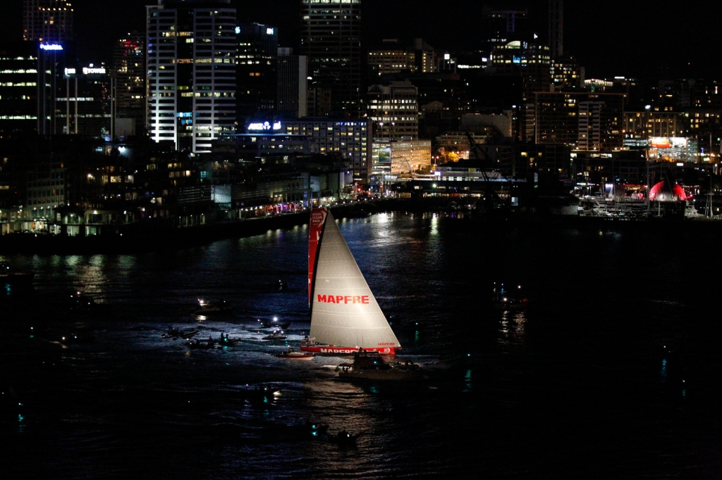 MAPFRE ha tagliato la linea del traguardo di Auckland, nota come la City of Sails nel buio della notte, punteggiato dalle luci della città alle 21.31.20 locali (le 9 e 31 del mattino ora italiana) di oggi 28 febbraio 2015,fra due ali di barche spettatori, accolto dal calorosissimo abbraccio dei fan neozelandesi.