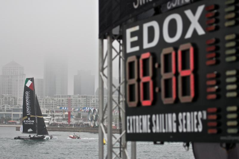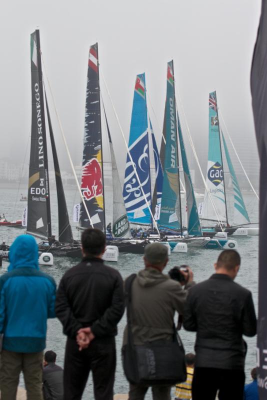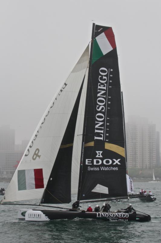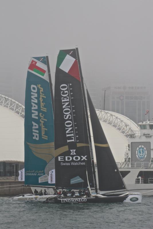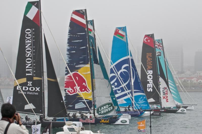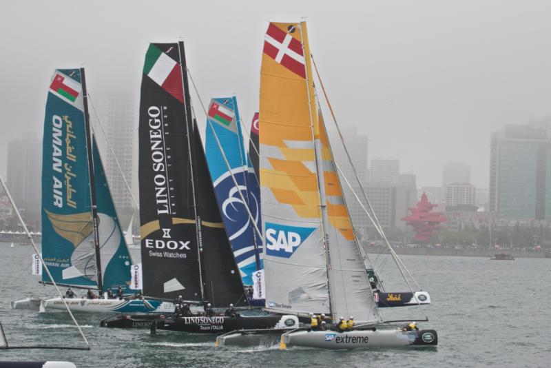 Seconda “giornata invernale” dell’Act3 delle Extreme Sailing Series di Qingdao (China), finalmente si regata. I giochi si aprono con condizioni meteo alquanto nebbiose, qualche goccia di pioggia attenua la consistenza della coltre e un vento leggero consente così al Comitato di Regata di posizionare il campo proprio al centro dello stadium racing, migliaia di persone assistono a questo spettacolo unico nel suo genere. Alle 13,56 le barche sono sulla linea di partenza, start nella versione “reaching”, si parte dal faro posto all’uscita del porto e si va verso il centro del canale che costeggia la banchina gremita di appassionati della vela.