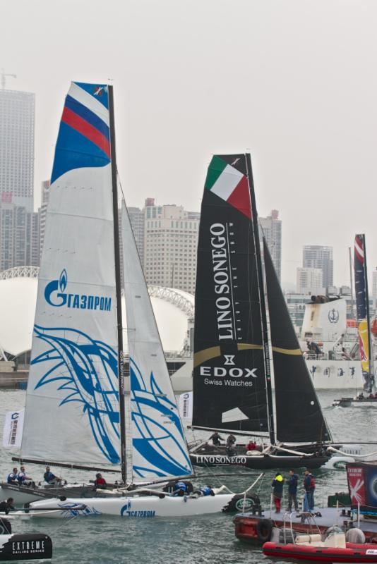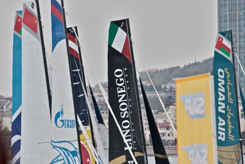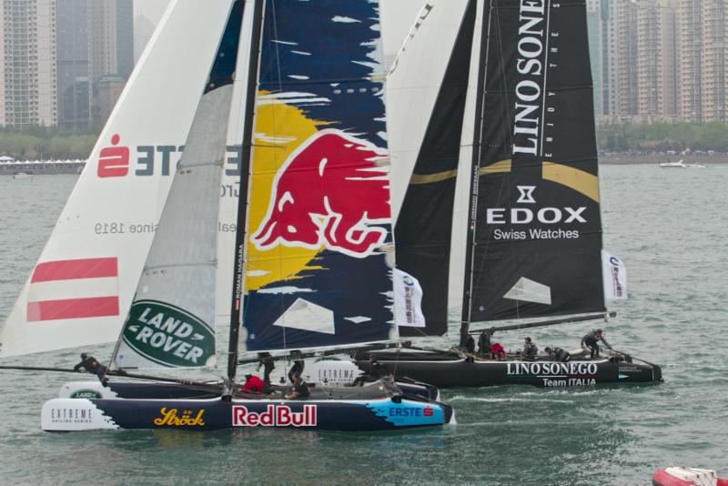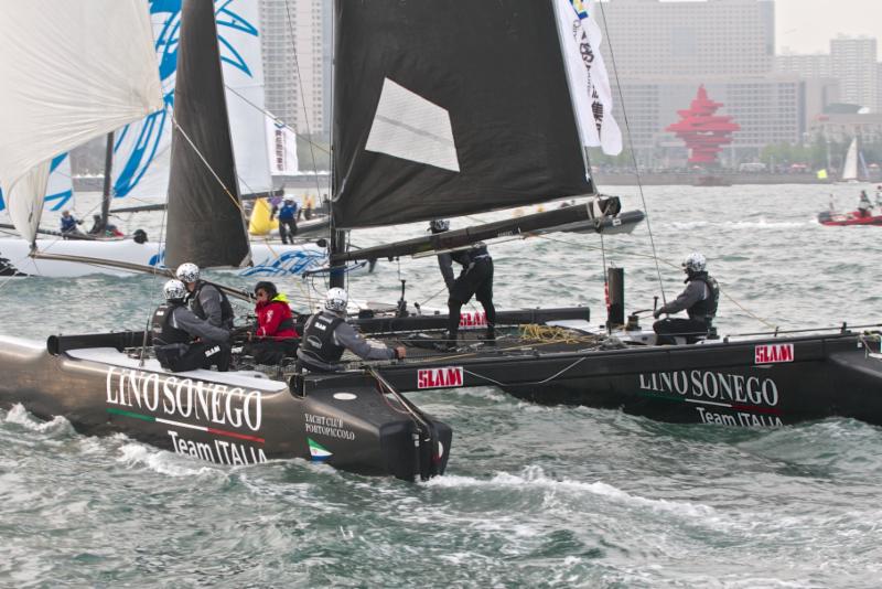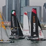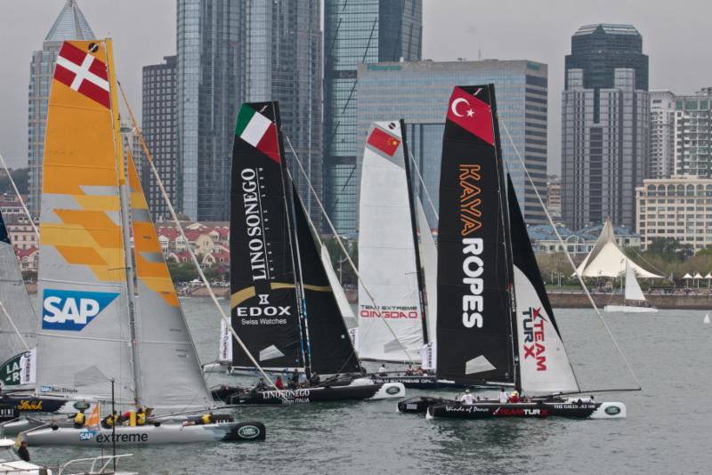 Terza giornata dell’Act3 delle Extreme Sailing Series di Qingdao (Cina), 8 regate per i team, un bel dispendio energetico per chi sta a bordo di queste formula uno del mare. Lo Stadium Racing conferma il tutto esaurito di presenze vedendo crescere ancora l’affluenza già imponente dei giorni scorsi, la pioggia della mattina all’ora di pranzo lascia il campo di regata, un sospiro per tutti. Condizioni meteo difficili dentro questo “ring” composto da moli e rive con una secca a tre quarti del lato vicino la partenza, un vero dilemma per gli skipper ie straordinari a bordo per i tattici. Il Comitato di Regata posiziona il campo proprio al centro dello stadium racing, una leggera rotazione rispetto alla linea di partenza di ieri, tutto è pronto, i giochi hanno inizio.