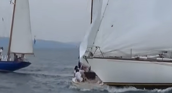 Il momento della collisione in boa tra Chaplin, cutter Marconi di 16,75 metri e Pyxis, un piccolo Wianno, a Porto Santo Stefano durante l’Argentario Sailing Week – Panerai Classic Yachts Challenge