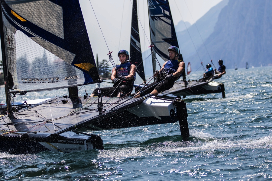 Queste imbarcazioni (5,50 metri di lunghezza per 3 di larghezza) sono dotate di derive a forma di J, chiamate foil, grazie alle quali sono in grado di volare letteralmente sull’acqua a una velocità che può raggiungere i 35 nodi (70 km). Il Red Bull Foiling Generation quest’anno è composto da sette tappe che si disputano in altrettante nazioni.
