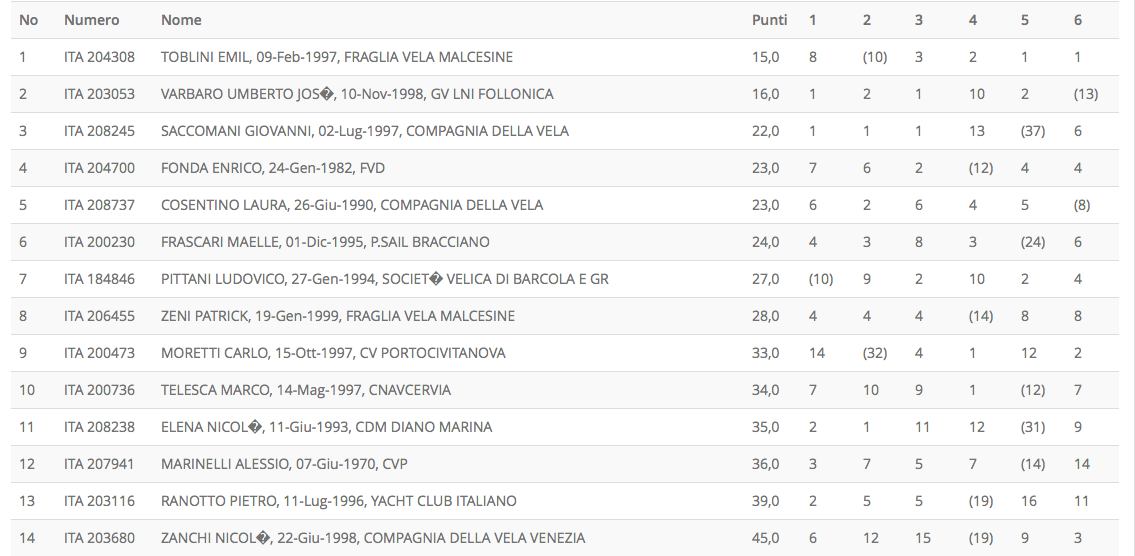 Tra gli atleti della Compagnia della Vela da registrare anche l’ottimo 14esimo posto della giovanissima Nicol Zanchi.
