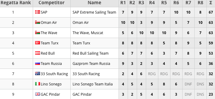 Nel corso di una prima giornata di regate caratterizzata da numerose penalità e collisioni, in cui la flotta si è ridotta da nove a sei imbarcazioni, hanno avuto la meglio SAP Extreme Sailing Team e Oman Air, rispettivamente primo e secondo in classifica provvisoria.
