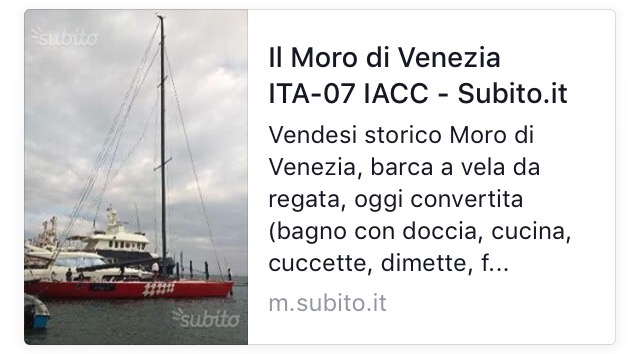 Il Moro di Venezia, la storica barca voluta da Raul Gardini per prendere parte alla Coppa America agli arbori degli anni 90 è in vendita. L’annuncio, pubblicato nella giornata di ieri nel sito di vendite subito.it, ha immediatamente suscitato un tam tam mediatico attraverso Facebook, ma si sarebbe trattato di un falso.