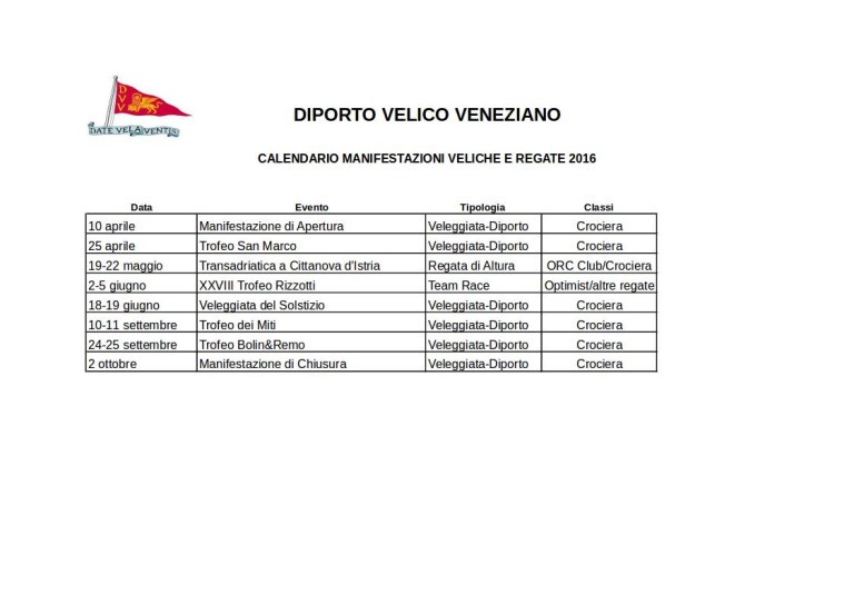 Il Diporto Velico Veneziano ha reso note il calendario delle proprie manifestazioni che verranno organizzate nel corso del 2016.