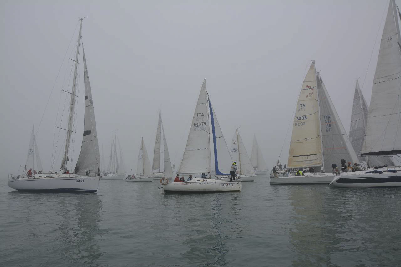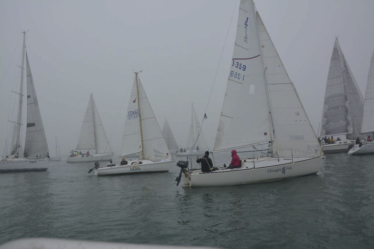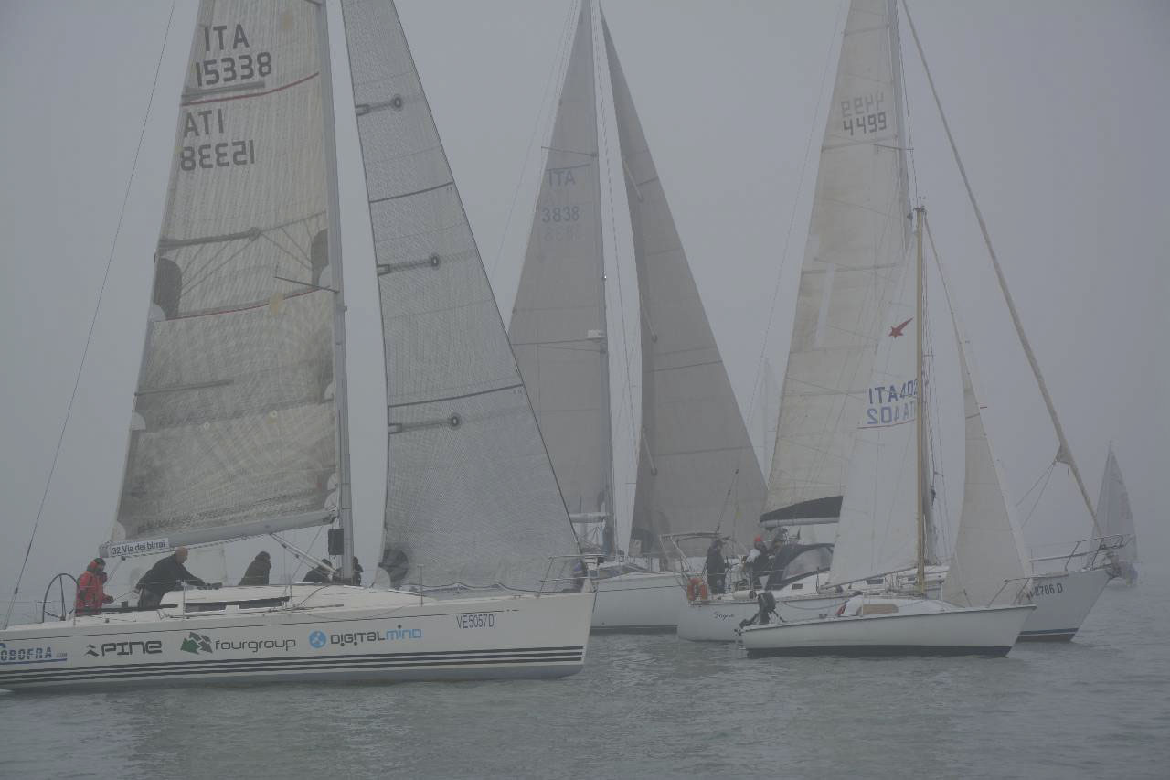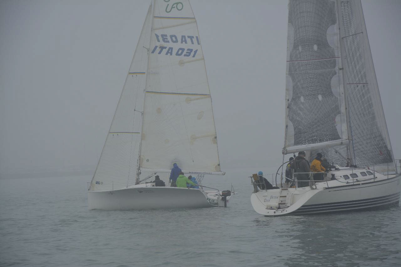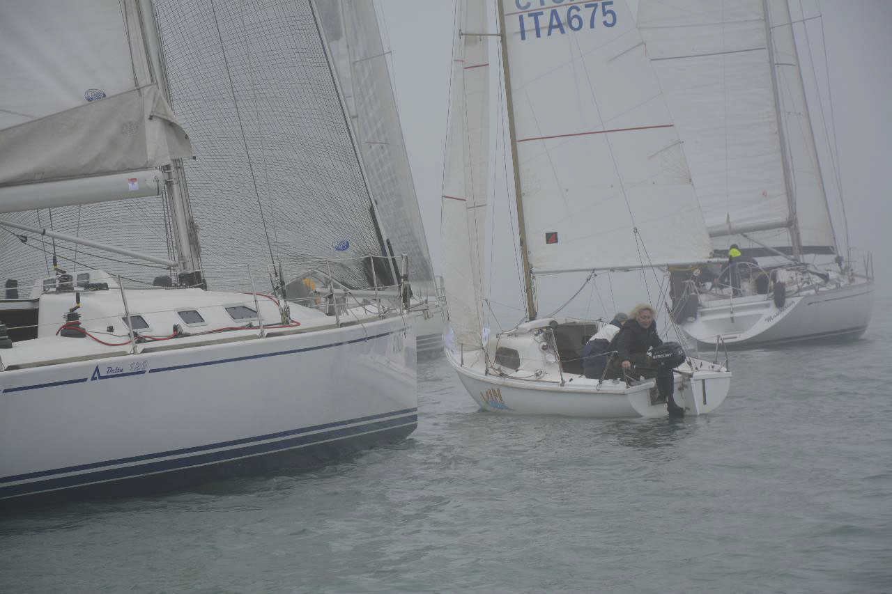 A far da cornice alla manifestazione, per la prima volta intitolata alla memoria di Roberto Ferro, una nebbia leggera e poco – troppo poco – vento. A complicare ancora di più le cose al comitato di regata e ai quasi duecento regatanti la forte corrente in uscita che non ha permesso alle imbarcazioni in regata di completare il giro del canale della Perognola come da programma, facendo così annullare la veleggiata pochi minuti dopo lo start.