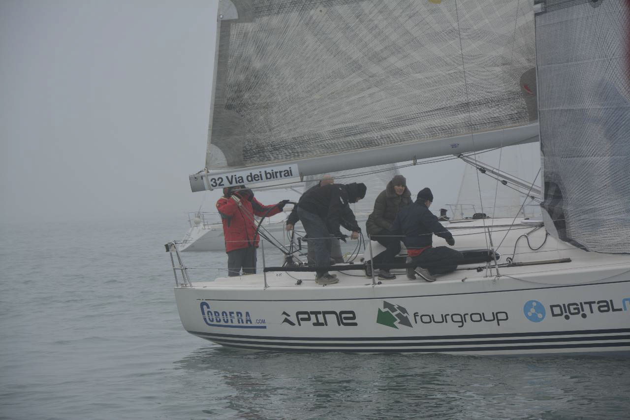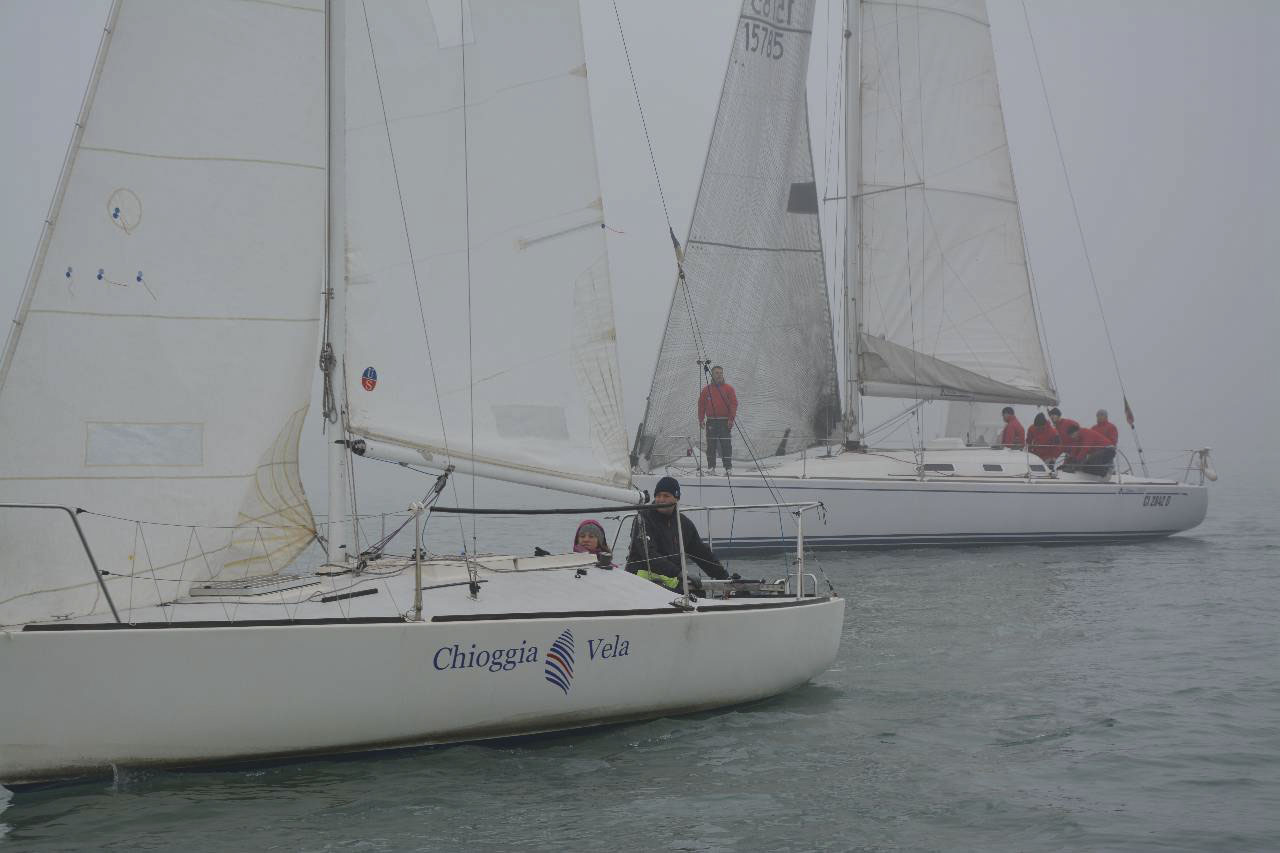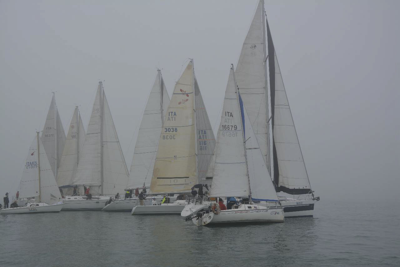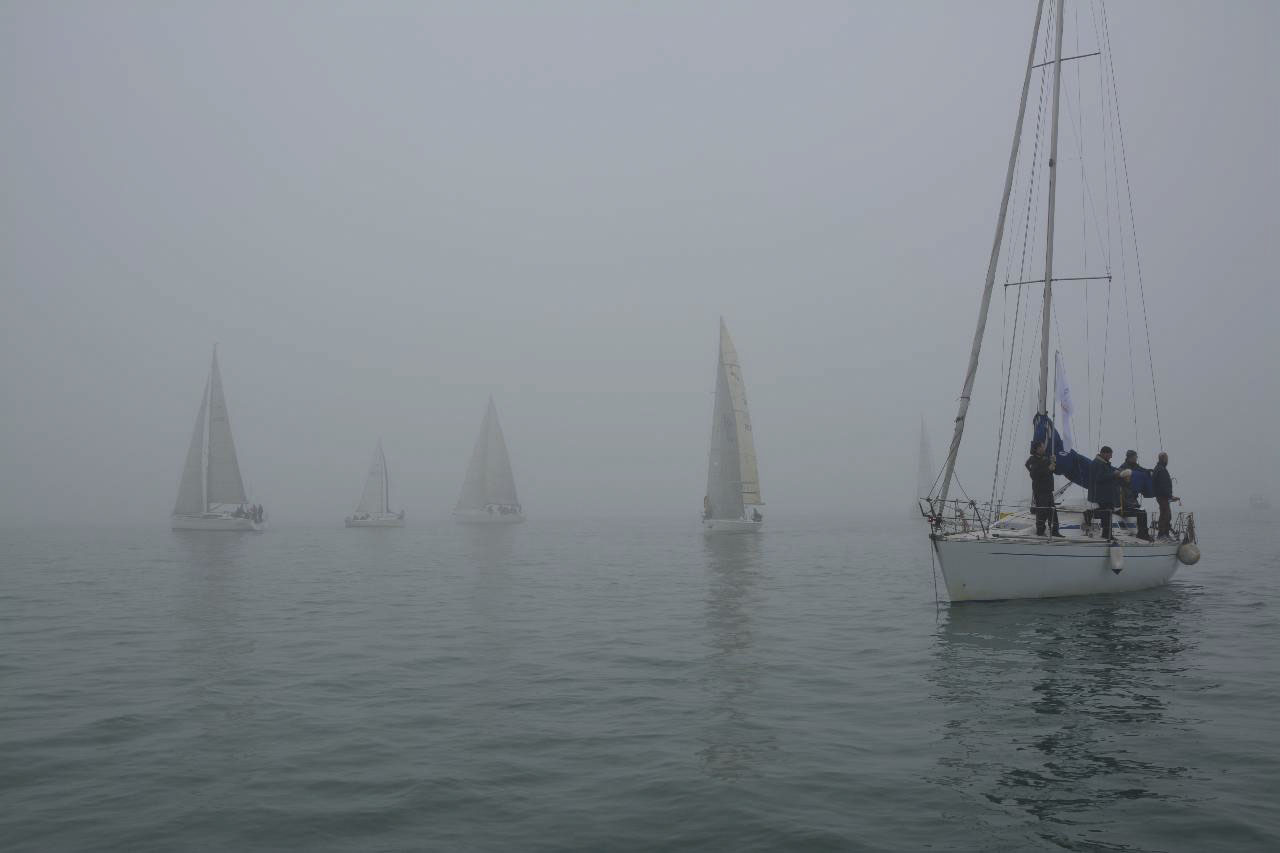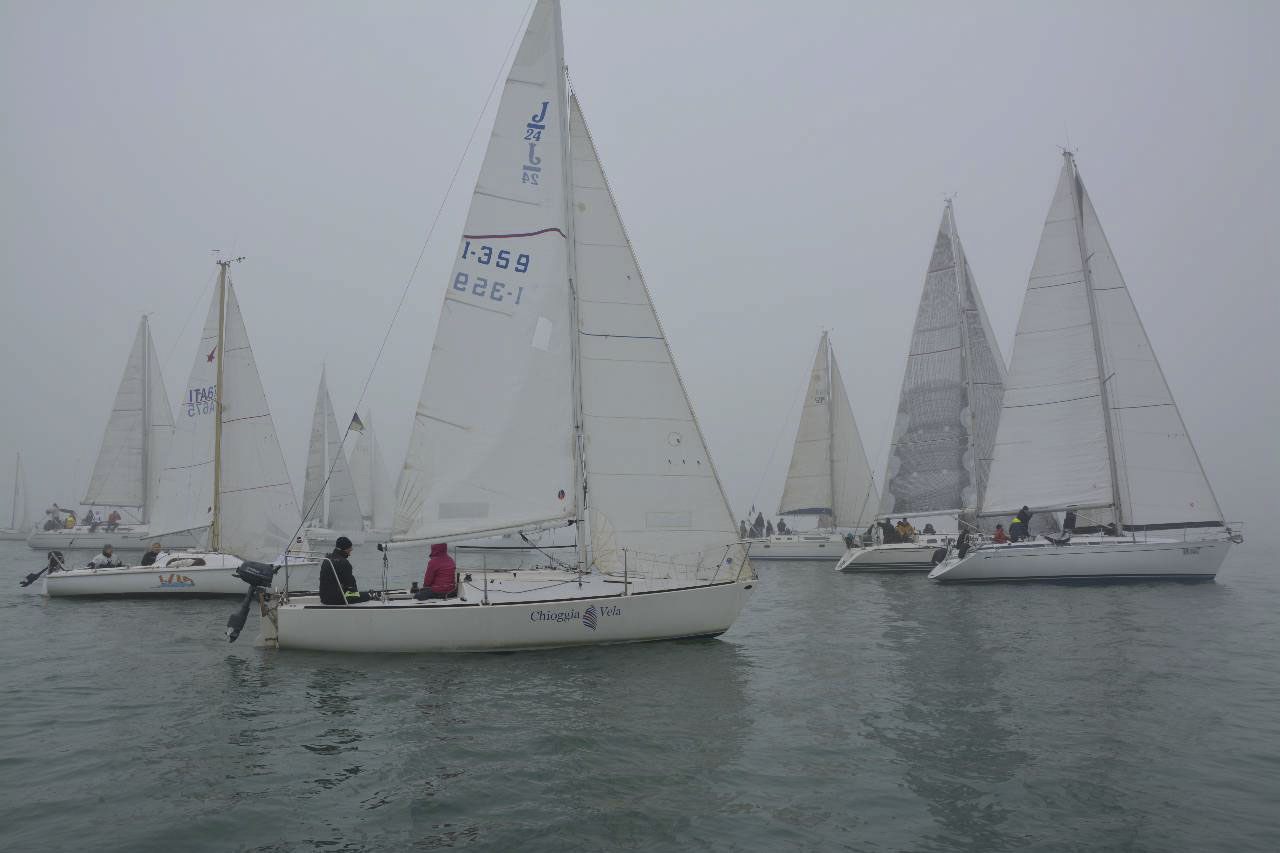 A far da cornice alla manifestazione, per la prima volta intitolata alla memoria di Roberto Ferro, una nebbia leggera e poco – troppo poco – vento. A complicare ancora di più le cose al comitato di regata e ai quasi duecento regatanti la forte corrente in uscita che non ha permesso alle imbarcazioni in regata di completare il giro del canale della Perognola come da programma, facendo così annullare la veleggiata pochi minuti dopo lo start.