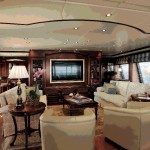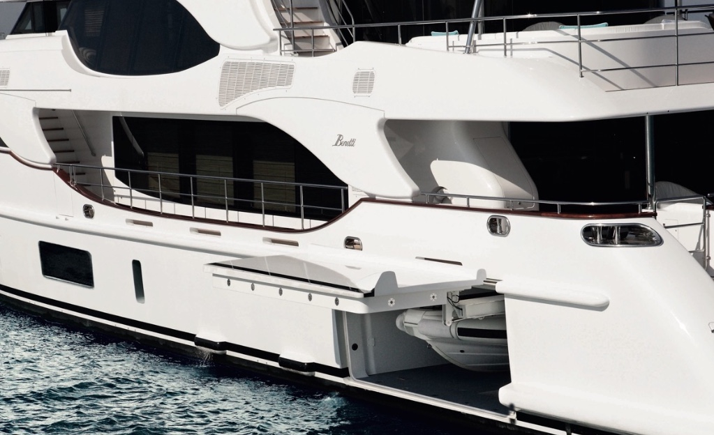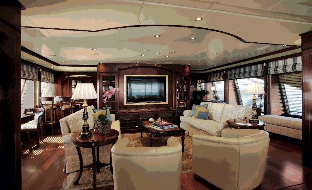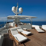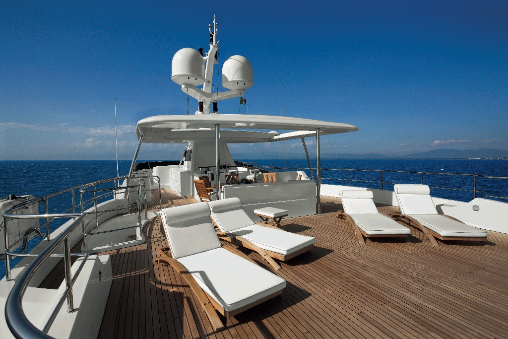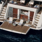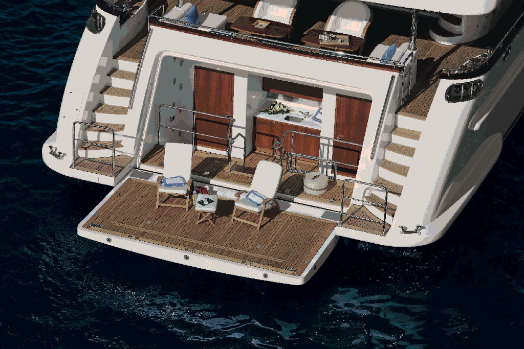 Negli interni si ritrovano le ragioni fondamentali del suo nome: una ridistribuzione degli spazi che sfrutta tutto il volume della carena e un’attenzione particolare alla luce grazie alle nuove finestrature oscura letteralmente concorrenza e passato. Quattro ponti abitabili, con ampie zone conviviali protette dalla massima privacy. Tra le principali novità, l’area di poppa presenta una riorganizzazione peculiare: il consueto garage per tender, moto d’acqua e le altre attrezzature è stato spostato avanti verso prua con una apertura laterale sul fianco consentendo così di dedicare tutta l’area di poppa a una beach area libera da tutte le attrezzature meccaniche e allestita con doccia, bagno, frigo, cucina, poltrone.