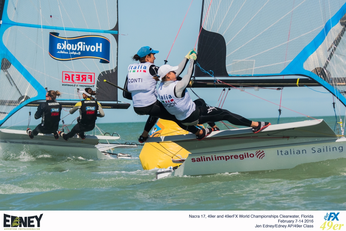 Super spettacolo in Florida per la quarta, appassionante giornata dei Campionati del Mondo delle classi olimpiche 49er, 49er FX e Nacra 17: ieri il campo di regata di Clearwater, dopo i primi, turbolenti giorni in cui il vero protagonista era stato il vento forte, ha offerto condizioni idilliache agli equipaggi impegnati in questo triplice evento iridato che riunisce le discipline più moderne dell’attuale programma olimpico. Una brezza costante tra gli 8 e i 12 nodi d’intensità, saliti fino a 15 nel corso del pomeriggio, ha consentito così ai doppi acrobatici maschili 49er e ai catamarani per equipaggi misti Nacra 17 di portare a termine ben quattro prove, tre per gli equipaggi del doppio acrobatico femminile 49er FX.