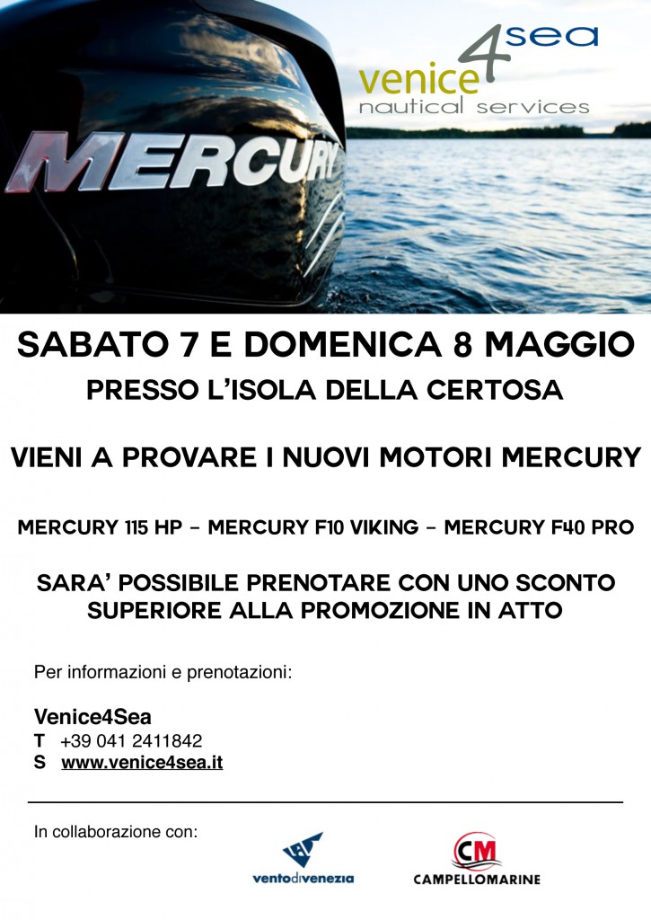 Nelle giornate di Sabato 7 e Domenica 8 Maggio dalle 10:00 alle 16:00, presso l’Isola della Certosa, verranno presentati i nuovi motori fuoribordo di Mercury Marine.