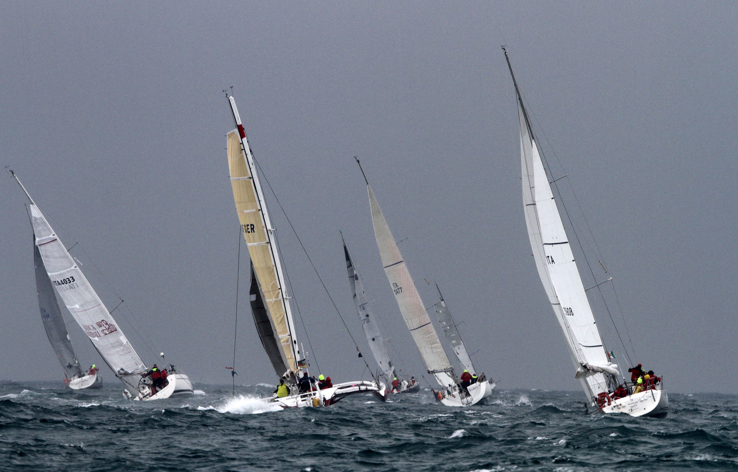 Le previsioni meteo annunciate ieri nel corso dello skipper meeting da Andrea Boscolo sono state rispettate in pieno: una perturbazione atlantica ha investito l’area di partenza, consegnando un avvio di regata come non si vedeva da anni a La Cinquecento. Cielo plumbeo, scrosci di pioggia e secchiate d’acqua salata dal mare, un vento di scirocco intorno ai venti nodi con raffiche fino a venticinque e onda formata, con equipaggi incerata e rande con una o due mani di terzaroli.