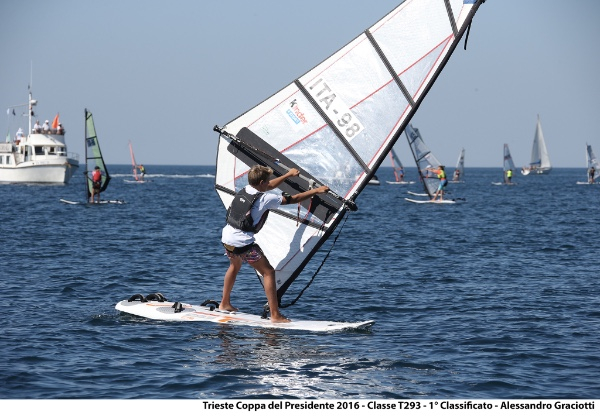 Per la conquista della Coppa del Presidente – dove la flotta era composta da 78 atleti del 2005 – Massimiliano Antoniazzi dello Yacht Club Adriaco mantiene staccati gli avversari Mattia Tognocchi (Circolo Nautico Marina di Carrara) e Nicolò Coslovich della Società Nautica Pietas Julia.