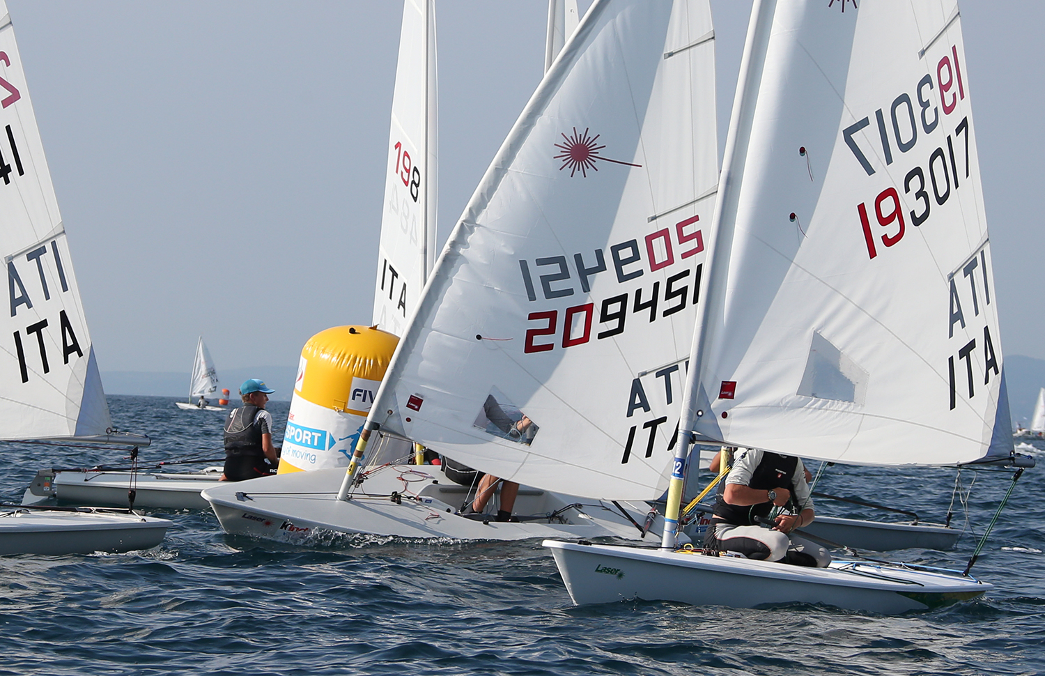 Campo al confine con le acque slovene per le flotte Laser 4.7 (103 partenti nati tra il 2001 e il 2004) e Laser Radial (102 atleti degli anni tra il 1998 e il 2001), che sono riuscite a chiudere due prove con vento tra i 4 e i 7 nodi. In entrambi i casi i soli Radial hanno completato l’intero percorso, mentre per i 4.7 il Comitato di regata ha deciso per un accorciamento.