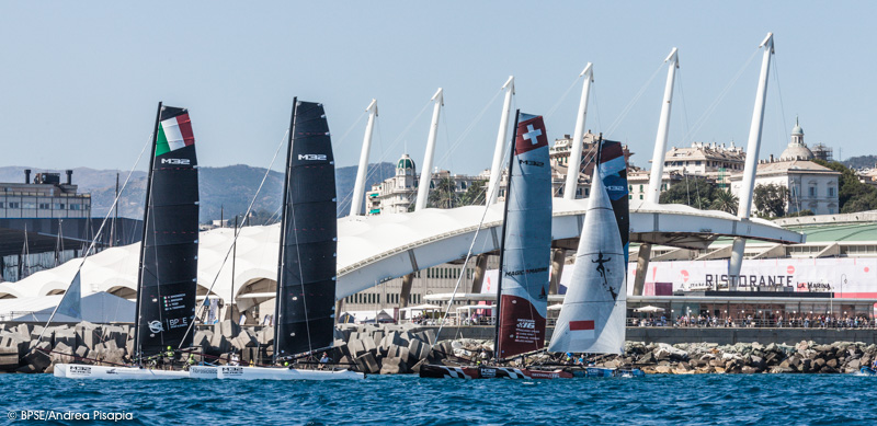 Una bella giornata conclusiva al Salone Nautico Internazionale di Genova, che grazie al vento sugli 8-10 nodi, ha permesso al numeroso pubblico di apprezzare le performance dei veloci catamarani M32 che con queste condizioni si esibiscono al meglio alzandosi su uno scafo con partenze a tutta velocità. Partenza ed arrivo erano posizionati a 10 metri dalla diga foranea del porto dove si trova la Fiera del Mare e da dove decine di persone hanno capito dinamiche e manovre grazie al commento di Stefano Vegliani, giornalista Mediaset.