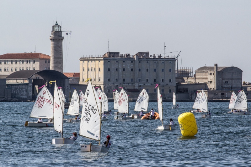 BARCOLANA YOUNG – Sole, caldo e vento sui 10-12 nodi da sud, la giornata inaugurale della Barcolana Young, manifestazione dedicata ai giovanissimi timonieri della classe Optimist, che hanno potuto portare a termine tre bellissime prove. Ben 142 cadetti dai 9 agli 11 anni e 119 juniores hanno dato vita ad una serie di regate (due batterie per categoria), che hanno visto via via aumentare il vento di scirocco arrivato fino ai 14 nodi sotto raffica con una bella onda formata che ha impegnato in poppa gli agguerriti mini-velisti.