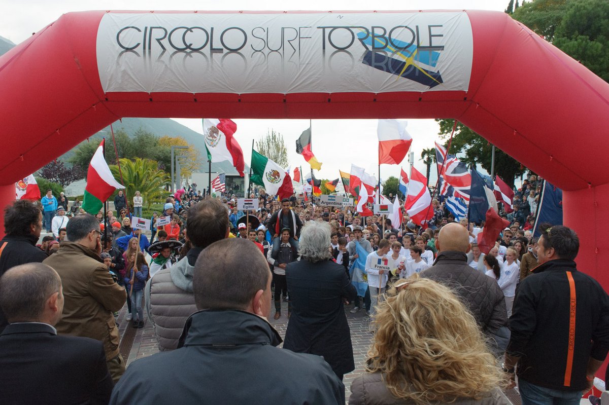 Emozione anche tra tutte le autorità presenti sul palco, che hanno voluto dare il proprio saluto ai partecipanti, augurando di regatare nella lealtà, nel rispetto delle regole sportive, potendo vivere una settimana dai grandi valori sportivi e umani in un evento che tra le altre cose è anche eco-sostenibile. L’assessore provinciale Tiziano Mellarini, il Sindaco di Nago-Torbole Gianni Morandi, il Vice-Presidente FIV Francesco Ettorre, il Presidente della XIV Zona FIV Domenico Foschini e naturalmente il Presidente del Circolo Surf Torbole Armando Bronzetti si sono susseguiti sul palco, ammirando lo spettacolo delle decine e decine di atleti sorridenti con sullo sfondo il lago increspato dal vento. Gran finale con la madrina Alessandra Sensini che ha tagliato il nastro, dichiarando ufficialmente aperta la manifestazione.