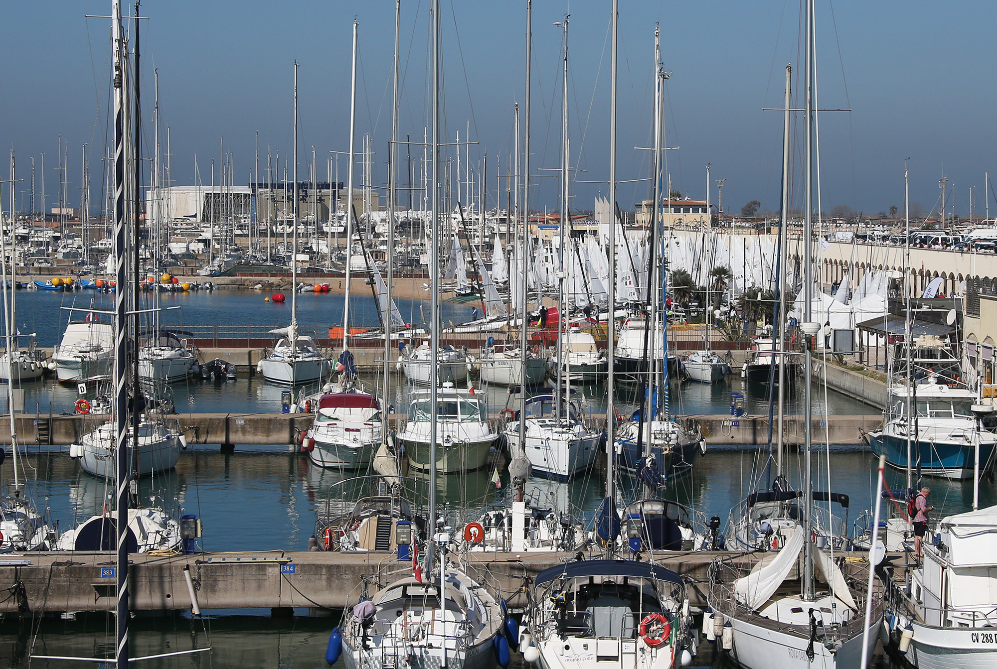 Un sole splendente, un bel cielo azzurro e una brezza tra i 10 e i 12 nodi d’intensità, in leggero calo il pomeriggio, hanno dato il buongiorno ai 300 atleti scesi in acqua a metà mattina per disputare la seconda delle quattro giornate di questo primo evento agonistico del progetto di riqualificazione del Porto Turistico di Roma attraverso lo sport, un accordo siglato a dicembre scorso fra la Federazione Italiana Vela e l’Amministrazione giudiziaria che da luglio 2016 ha in carico la struttura portuale di Ostia. Uno scenario magnifico, con circa 200 vele distribuite lungo cinque campi di regata, molto apprezzato anche dalle numerose persone che nel corso della giornata hanno affollato le banchine del Porto Turistico di Roma, sede logistica dell’evento, prologo della folla attesa nel week end.