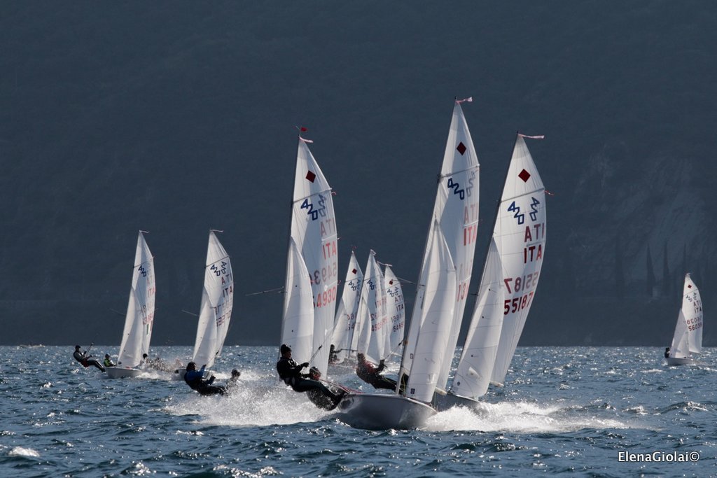 La classifica ha attualmente 4 prove in tutto, con inserito lo scarto della peggiore. La situazione dei primissimi equipaggi è molto equilibrata: in testa i locali Spagnolli-Rio, settimi ai mondiali Giovanili in Nuova Zelanda (24-1-4-1, FV Malcesine), in parità di punteggio con Elena Picotti e Francesca Campri (2-15-1-3, FV Peschiera). A 3 punti i liguri Ferraro-Orlando (YC Sanremo, campioni del mondo U17 420 nel 2015) protagonisti di un primo parziale in regata 3. Al quarto posto, a 6 punti di distacco gli altri portacolori dello Yacht Club Sanremo Cilli-Mantero, primi under 17 e campioni europei in carica. Seguono una decina di equipaggi in una classifica cortissima, che garantisce per le ultime regate una lotta all’ultima strambata. Anche domani partenza prevista la mattina presto, sperando nella disputa di tutte e tre le regate, prima di un ulteriore cambio di tempo previsto per il pomeriggio.