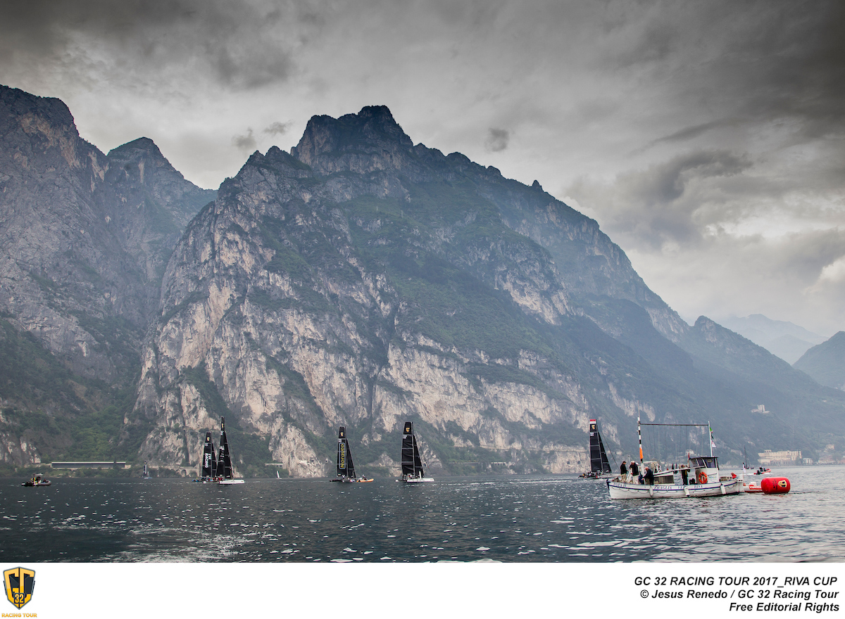In tarda mattinata gli undici catamarani GC32 sono usciti dal porticciolo della Fraglia Vela Riva, nella parte più settentrionale del Garda, per raggiungere il campo di regata con una buona Ora, il vento meridionale del lago, che alsciava ben sperare. Sfortunatamente però, solo pochi minuti prima della partenza, il vento è scomparso lasciando il posto a una foschia che nascondeva parzialmente anche le imponenti montagne che circondano Riva del Garda.
