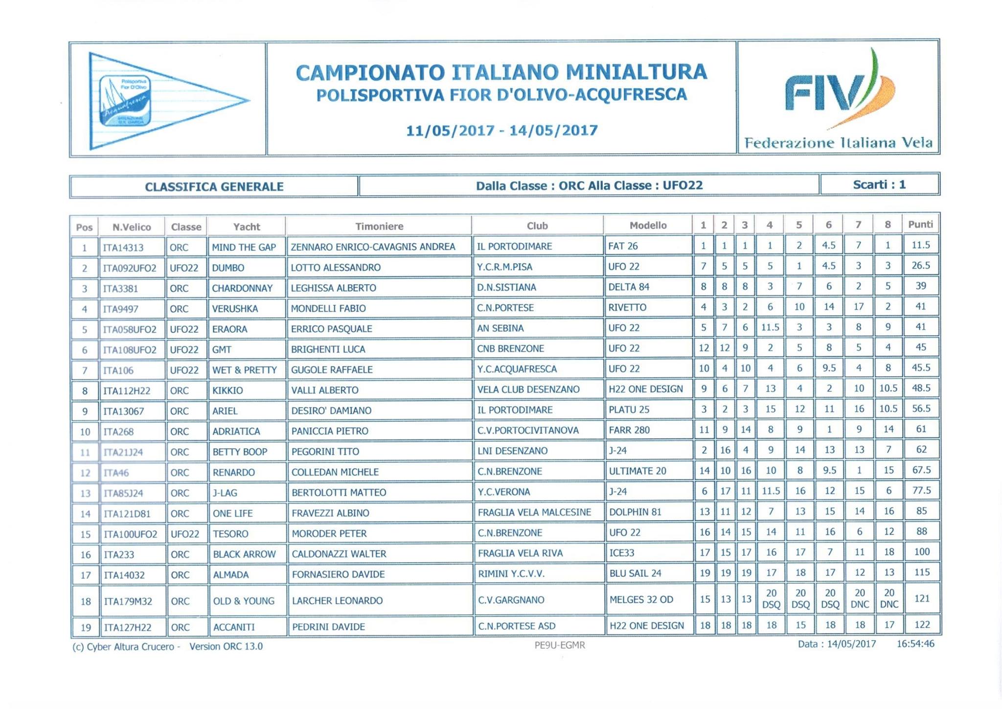 Con cinque primi posti guadagnati, a fronte delle otto prove disputate, Mind the Gap ha solidamente conquistato la leadership nella classifica con un totale di 11.5 punti e un margine di 15 sull’inseguitore principale, l’UFO 22 Dumbo di Alessandro Lotto. Terzo gradino del podio è andato a Chardonnay di Ugo Guarnieri, con Alberto Leghissa al timone.