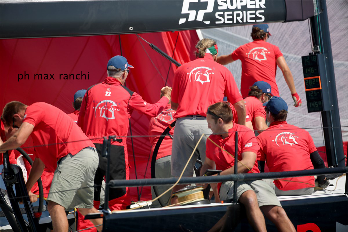 La terza tappa delle 52 SUPER SERIES entra nel vivo della sfida, oggi, con tre prove disputate, la classifica generale segna il sorpasso di Platoon dell’armatore timoniere Harm Müller-Spreer. Una giornata “anticipata” dal Comitato di regata che è riuscito a gestire al meglio le previsioni che davano inizialmente un vento da nord est in rotazione a nord ovest. Molto scaltramente i giudici hanno dato il via della prima prova alle 11.30, come da schedule previsto già ieri sera. Una prova accorciata al passaggio della seconda boa di bolina per il previsto calo e rotazione del vento. Azzurra nella prima manche sa dove andare, sa come gestire lo spauracchio americano al punto tale di andar sempre sopra di lui, una serie di virate da Matche Race tra la coppia Vascotto-Parada e Hutchinson-Gulari, gli altri stanno a guardare. Una sorta di podio rovesciato, dove Azzurra chiude in testa la prima prova davanti a Quantum e Platoon che sembra avere il feeling giusto con questo campo di regata e l’adeguata intensità del gruppo. Gladiator è fanalino di coda, una partenza da dimenticare per Tony Langley ed il suo tattico Ed Baird.