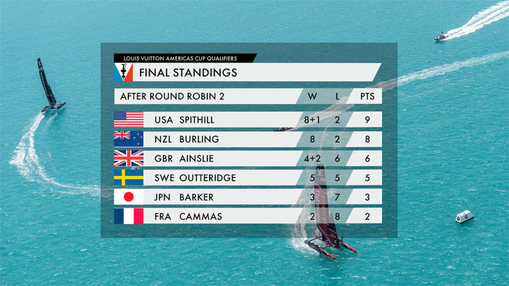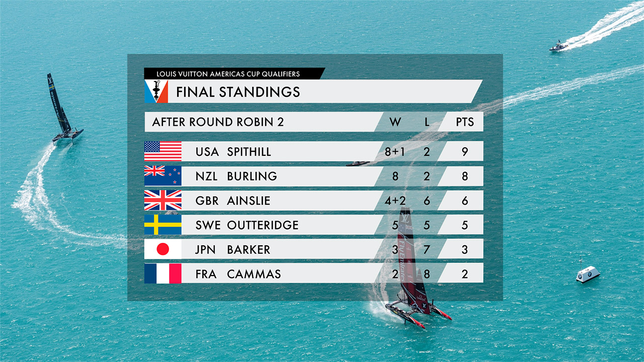 La classifica finale dei round robin vede quindi davanti a tutti gli americani di Oracle che precedono di un solo punto i neozelandesi di Team New Zealand, quindi il team ingelese di Sir Ben Ainslie e gli svedesi.