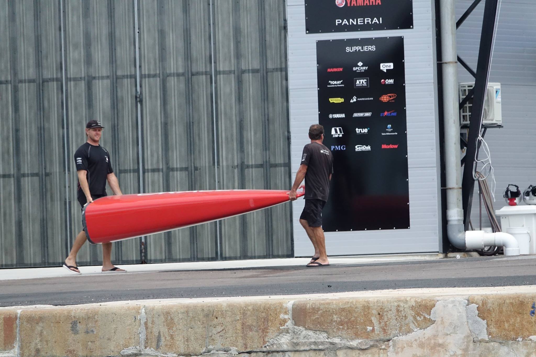 Il protocollo prevede che solo il defender – e quindi in questo caso Oracle – possa costruirsi una imbarcazione di riserva. Cosa che fino a qui non era ancora accaduta. Fino a ieri, perchè – come dimostra la foto – due uomini, comodi ed in infradito, trasportano la prua di un Ac 50 dalla base di Softbank Team Japan verso quella degli americani.