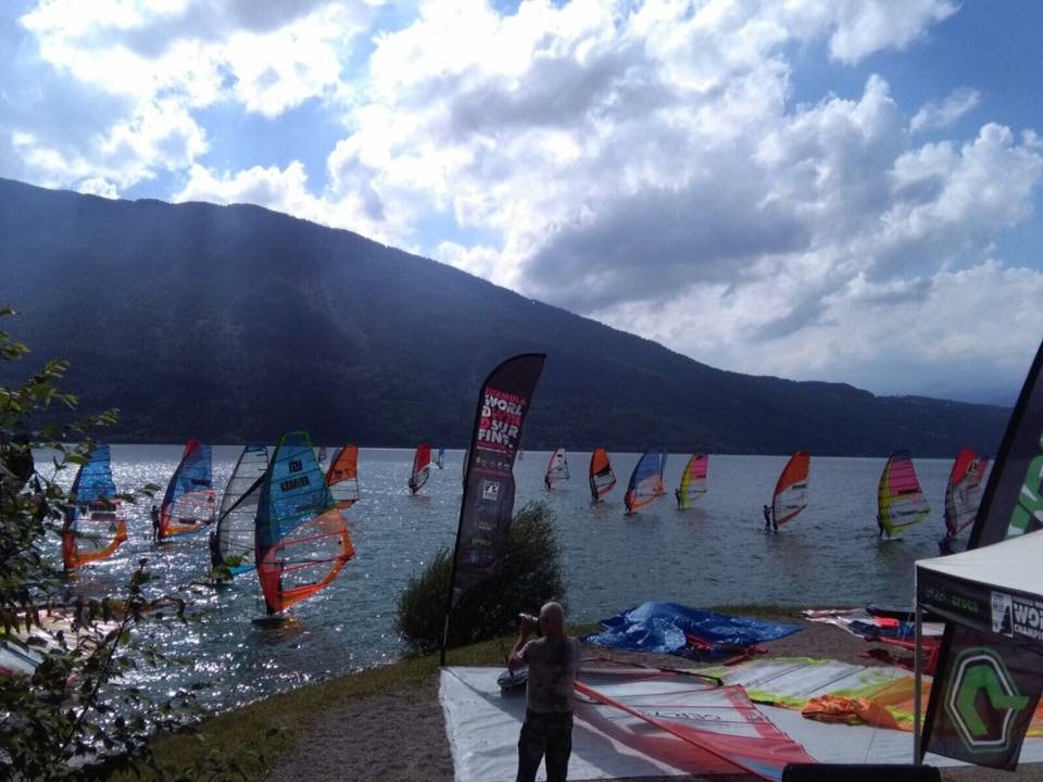 Il vento, superiore ai 15 nodi in molte fasi delle regate, in questa giornata proveniva più da sinistra rispetto alle precedenti giornate, ed il sole veniva talvolta coperto da grosse formazioni nuvolose che rimanevano comunque al di fuori dell’area del lago.