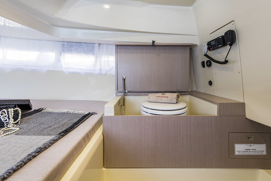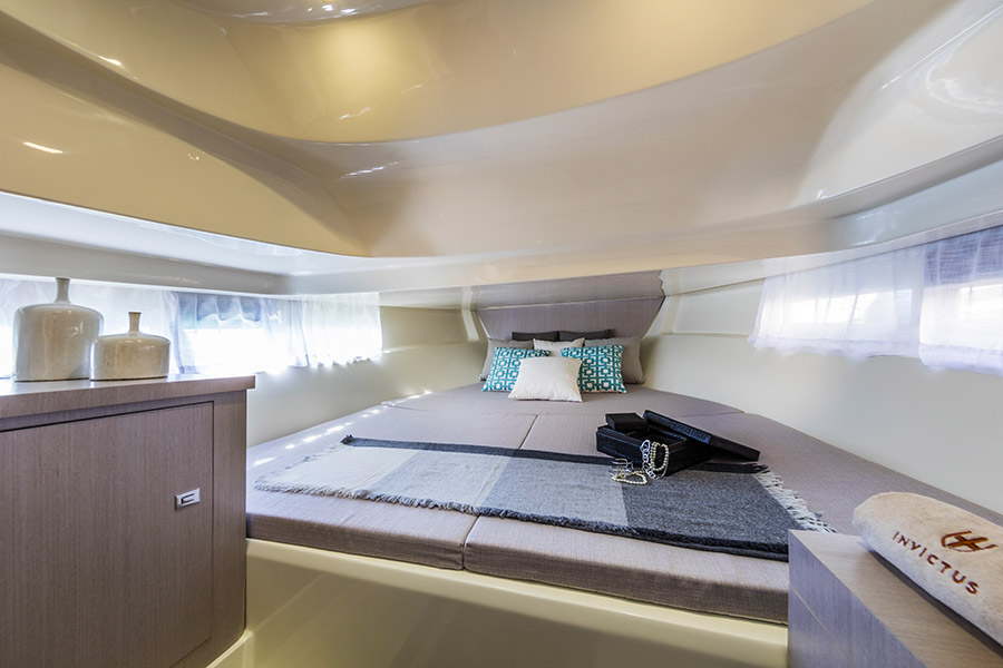 Una gamma disegnata, come tutte le altre del cantiere, da Christian Grande e che si pone come perfetto simbolo dell’italian style incarnato da Invictus Yacht. Gli spazi interni sono molto più ampi se comparati ai concorrenti di pari misura, pur mantenendo al contempo un profilo sportivo grazie all’equilibrio tra disegno della carena e profilo della tuga. Grandissima attenzione è stata posta nella lavorazione delle finiture e dei dettagli, non solo per quanto riguarda i materiali, ma anche per tutte le alternanze cromatiche.