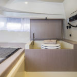 La timoneria si sviluppa verticalmente, consentendo così una guida particolarmente precisa, grazie all’impostazione ergonomica studiata con attenzione. Il cuore della zona “living” si sviluppa a centro barca, con il sedile di guida “stand up”, che può essere facilmente trasformato per completare la zona dinette di poppa, creando un vero e proprio “seating”, dedicato a chi ama vivere la propria imbarcazione come luogo conviviale. Un sistema trasformabile che viene fornito di serie. Non manca la protezione dal sole nelle ore più calde, ottenuta grazie al tendalino a scomparsa che si estende sull’intera zona living.
