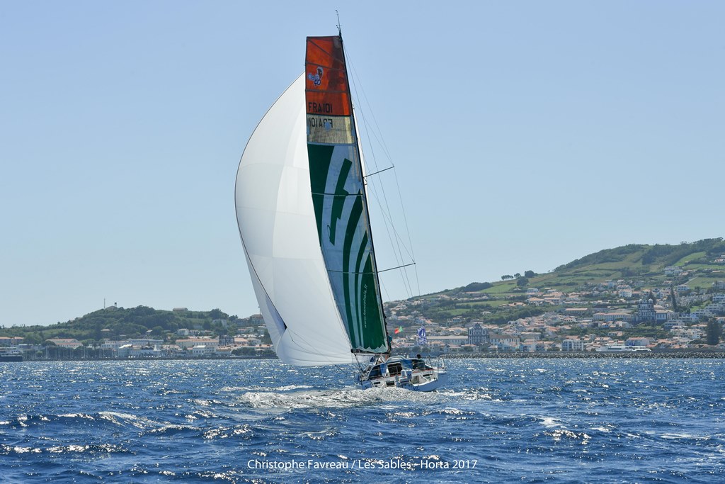 In serata il vento ha stretto ed è calato. Il 6/7 giornata “a far camminare”, bolina larga sotto gennaker grande con aria leggera, molte regolazioni di fino, occhio sulla velocità e sugli aggiornamenti ogni due ore delle posizioni. Il 7 un promontorio di alta pressione ci sbarra la strada diretta per le Azzorre e a Nord si sta approfondendo una depressione che porterà del vento. Siamo quarti seguiamo Stella Nova un Mach 2 molto ben condotto e siamo seguiti da Oman Sail un pò staccato. L’aria cala, Stella Nova rallenta chiudiamo la distanza a 5 miglia e immediatamente viriamo verso Nord / Nord Ovest per evitare la bonaccia di fronte e muoverci verso il fronte depressionario. Ma dopo 40 minuti anche Stella Nova vira giusto in tempo prima di piantarsi e finisce per noi la speranza di passarlo. Rapidamente il cielo si copre e nella notte arriva il fronte . Siamo lontano dal centro ed il vento è solo sui 15 nodi con pioggia fitta. Poi d’improvviso il fronte passa ed il vento salta da SW a NW. Neanche il tempo per Massimo di uscire per virare che Pietro si trova la barca sulle altre mura! Adesso la prua è di nuovo sulle Azzorre ma la barca picchia molto contro l’onda del vecchio vento dritta di fronte. Il mattino del 8: terra. E’ St. Cruz de Graciosa la prima isola che avvistiamo. La passiamo ed il vento si allarga: su lo spinnaker. Bordo sotto l’inospitale costa NE dell’ Isola Sao Jorge a strapiombo sul mare . Poi, ecco lo spettacolare vulcano di Pico in fronte alla nostra destinazione l’isola di Faial. Bordeggio in poppa verso Horta con l’aria che cala sino al solito rafficone sulla linea di arrivo che ti costringe a fare qualche numero. Ma tutto bene, il quarto posto è assicurato. Siamo contenti abbiamo fatto una bella regata.