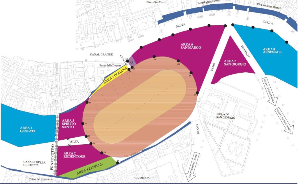 • AREA 1 (Gesuati) Lato ad Ovest del ponte votivo: unità da diporto, imbarcazioni da traffico marittimo, pescherecci, imbarcazioni destinate al trasporto persone ed altre unità di stazza superiore a 10 T.S.L. o a più ponti. Il deflusso in direzione Lido potrà avvenire tramite i canali retro-Giudecca, Ghebo dei Cani ed Orfanello.