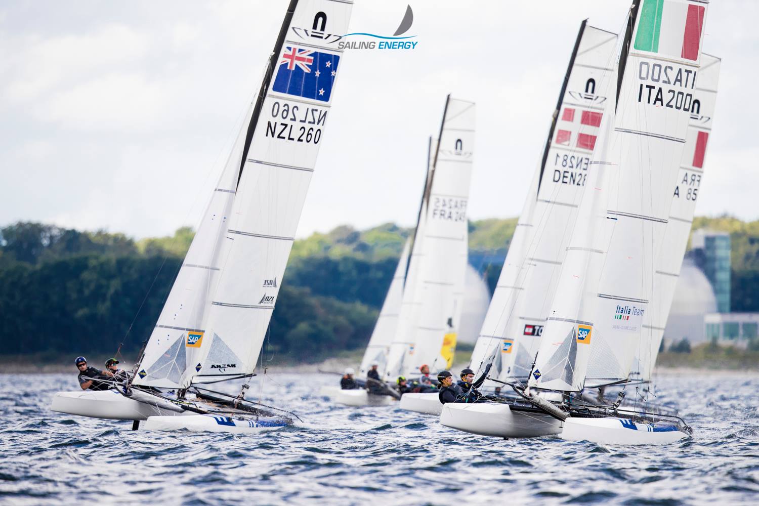 Vento leggero oggi a Kiel, in Germania, così leggero da far persino temere di non riuscire a regatare, ma una leggera brezza sui 6 nodi è entrata sul campo ed ha permesso di disputare tre prove per i Nacra17 e i 49erFX e due per i 49er.