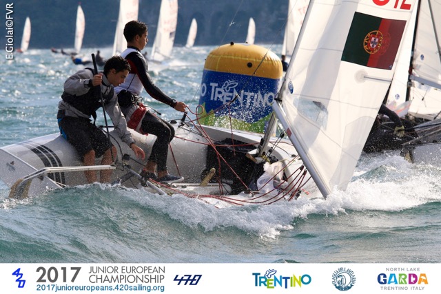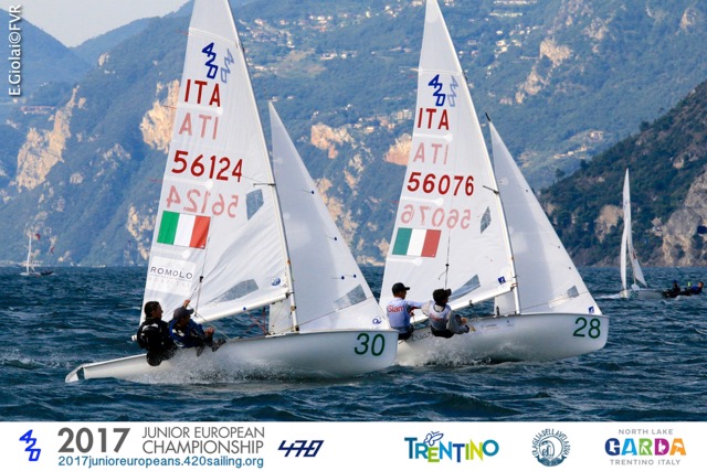 Finalmente bel vento sui 15-20 nodi a Riva del Garda nella terza giornata dei campionati europei Juniores organizzati dalla Fraglia Vela Riva per le classi 420 e 470: per i regatanti della classe 420 ne è valsa la pena svegliarsi presto per trovarsi pronti alle 8:00 sulla linea di partenza posizionata dallo staff della Fraglia Vela Riva e dal Comitato di regata FIV. Il campo di gara è stato preparato per il vento da nord, che dopo il temporale della notte, è arrivato puntuale la mattina presto con il sole. Dopo due giornate di vento leggero oggi dunque la situazione è cambiata e non sono mancati i numeri per domare le raffiche che hanno soffiato anche fino a 20 nodi. Come da programma per la sola classe 420 si sono disputate due prove, concludendo così la fase di qualifica, mentre per i 470 c’è stato un nulla di fatto dato che avrebbero dovuto iniziare a regatare alle 13:00, ma l’avvicinamento di un fronte perturbato non ha permesso l’arrivo del vento del pomeriggio.