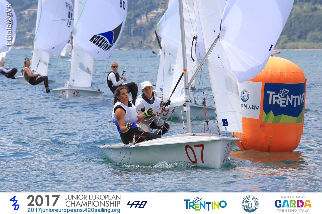 Ancora vento leggero sull’Alto Garda nella seconda giornata dei Campionati Europei Juniores organizzati dalla Fraglia Vela Riva per le classi 420 e 470 e che vede in gara quasi 500 velisti di età media sui 16-17 anni provenienti da 25 nazioni. E’ la classe 470, nel campo di regata posizionato più a sud, che ha sofferto di più le condizioni anomale dell’Alto Garda di questi primi 2 giorni, con vento leggero sui 5-6 nodi, contro anche ai 10-11 del campo di regata della classe 420. Qualifiche comunque che procedono con ulteriori 2 regate e lo scarto che è stato applicato con la quarta prova di oggi. Finora si sono svolte regate molto tecniche in condizioni piuttosto inusuali per l’Alto Garda, con vento leggero e acqua praticamente piatta, a causa del tempo a tratti perturbato, che non permette di sviluppare la consueta termica che può arrivare anche a 20 nodi.