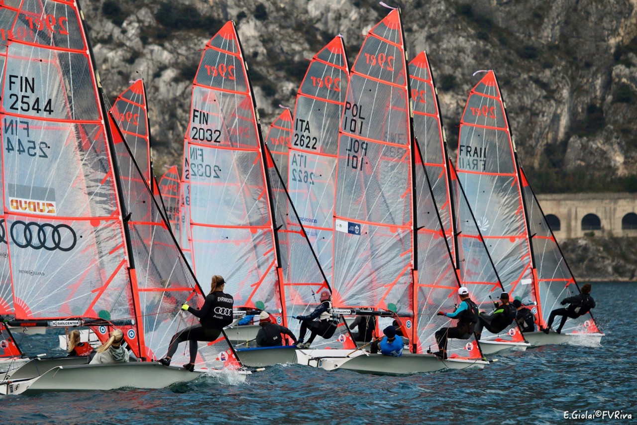 Ancora vento leggero nella seconda giornata della 29er Eurocup, evento internazionale dello skiff giovanile che sta avendo sempre più successo, organizzato fino a domenica dalla Fraglia Vela Riva. Nonostante la levataccia con partenza puntualissima alle ore 8:30 le condizioni in realtà sono state molto tranquille con vento da nord che per un momento ha toccato i 10-12 nodi per poi tornare su un range molto più basso a causa della nuvolosità, che ha rallentato la spinta delle raffiche rimasta per lo più sui 7-8 nodi. Regate comunque molto tecniche e ancora una volta alla portata di tutti gli equipaggi, anche dei più giovani e meno esperti, molti dei quali presenti a Riva del Garda per cambio classe (dall’Optimist, O’Pen Bic o RS Feva). Si porta dunque a 3 regate il bilancio della manifestazione, che se la mattina ha visto la disputa di due prove, per il pomeriggio l’attesa è stata invana. Al momento stanno facendo la parte del leone i britannici con 3 atleti nei primi 5: in testa l’equipaggio femminile timonato da Freya Black con a prua Millie Aldrige, le più regolari (2-7-4), ma alle loro spalle ad un solo punto i francesi (terzi assoluti al mondiale) Revil-Guevel che dopo un dodicesimo hanno piazzato oggi due primi; terzi gli altri britannici Freddie-Elliott, primi in regata 2 (11-1-5). Primo parziale nella seconda ed ultima regata di giornata per i tedeschi Mueller-Ulrich. Migliori italiani sempre Cestari-Carbonelli (Soc. Can. Garda Salò), diciottesimi (5-23-9). La strada è ancora molto lunga, anche perchè se il vento nei prossimi giorni sarà più generoso si potranno ancora fare 4 regate al giorno con l’inserimento degli scarti che faranno sicuramente la differenza. Sabato ancora partenza la mattina alle ore 9:00.