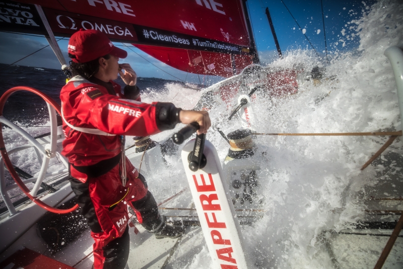 “Non abbiamo riposato molto, si fa fatica a dormire in queste condizioni. Ne abbiamo ancora per 24 ore, poi il vento e il mare dovrebbero diminuire. E’ stata una nottata bagnata, con 30/35 nodi, e una lotta serrata. Ma per ora tutto bene.” Ha raccontato Antonio ‘Ñeti’ Cuervas-Mons, prodiere e boat captain di MAPFRE.